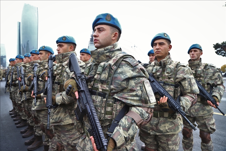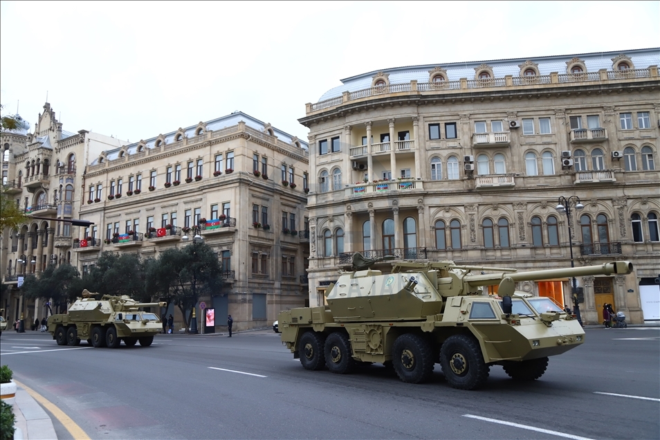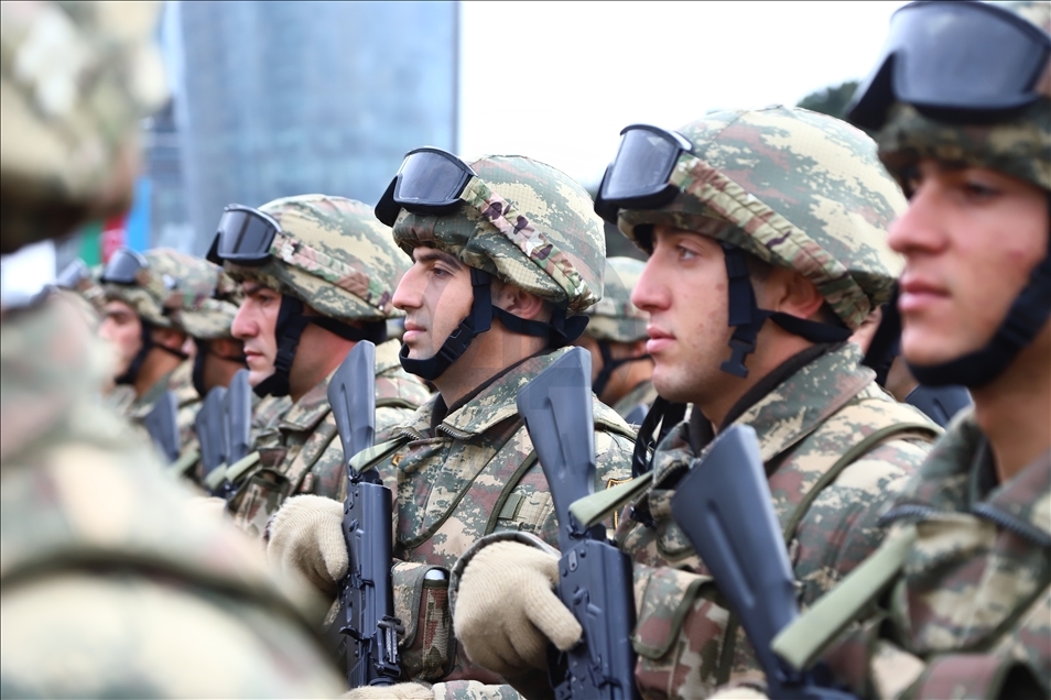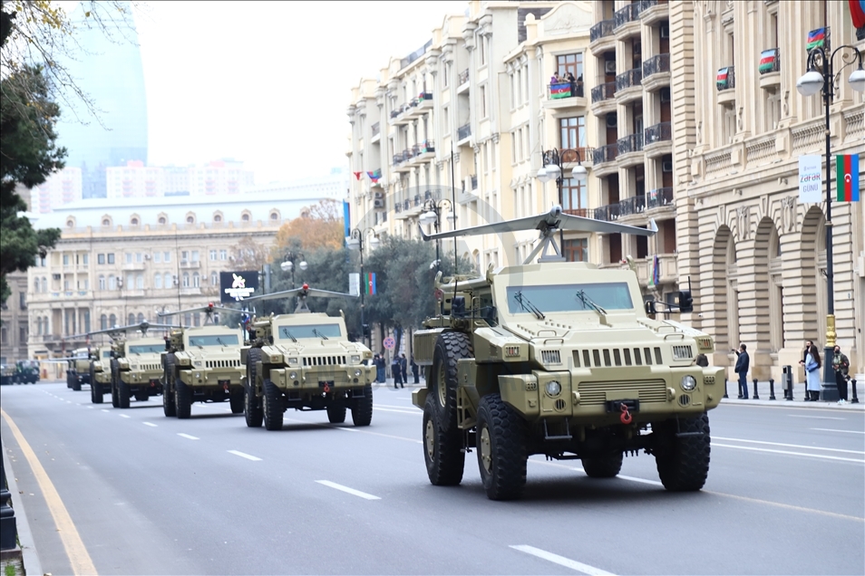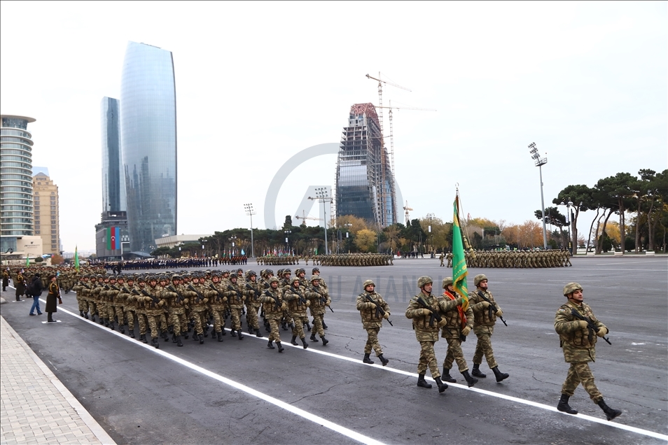 Azerbaijani and Turkish soldiers take part in the rehearsals in the streets of Baku ahead of the military parade, which will be held to mark the Azerbaijani Army's entrance to Nagorno-Karabakh.Resul Rehimov