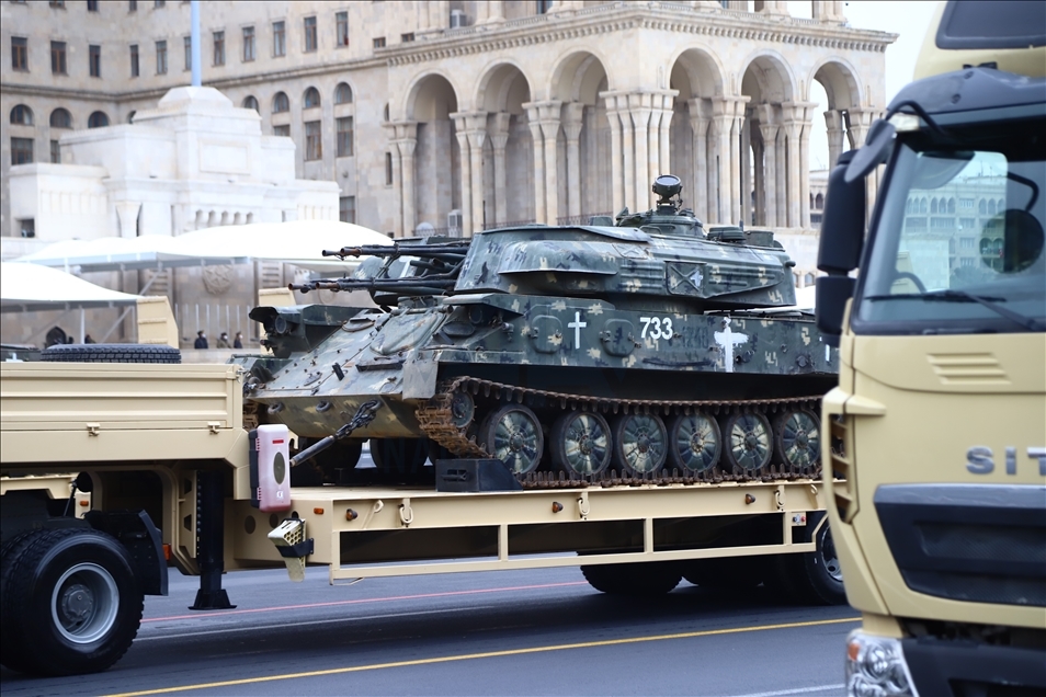 A military truck carries a tank in the rehearsals in the streets of Baku ahead of the military parade, which will be held to mark the Azerbaijani Army's entrance to Nagorno-Karabakh.Resul Rehimov