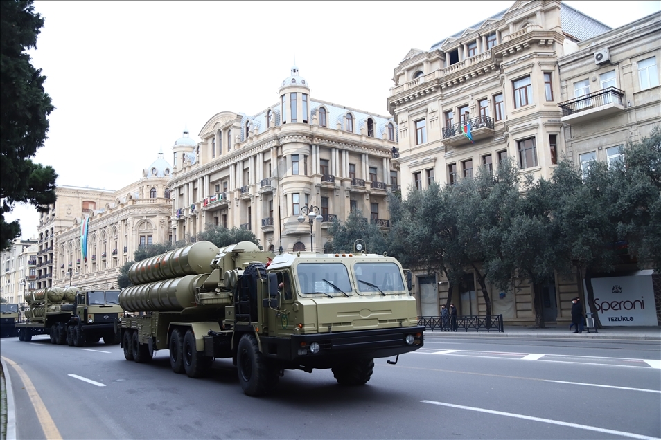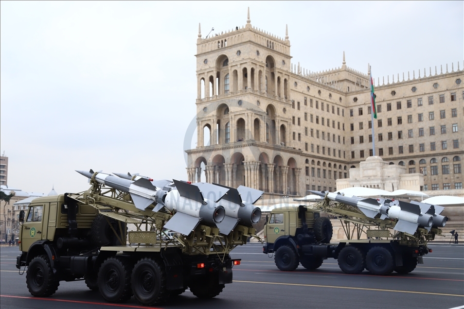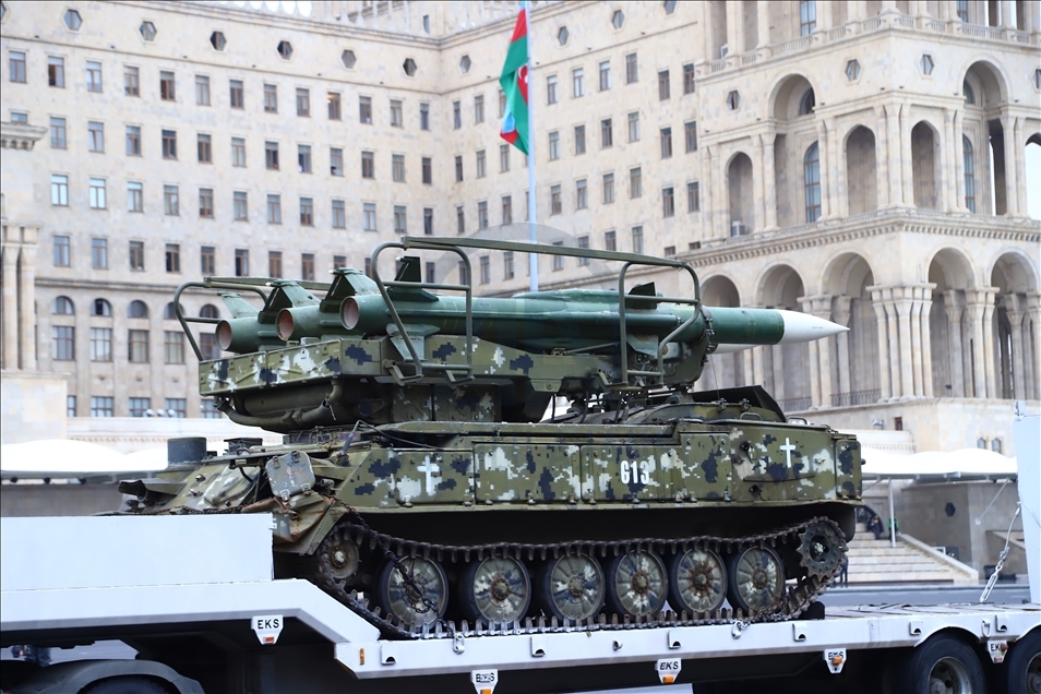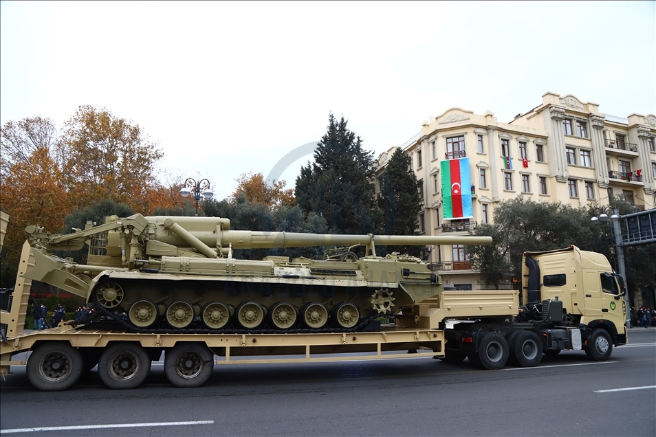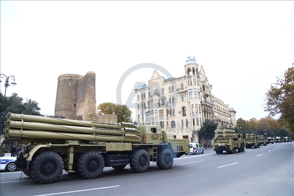 Military trucks pass the streets of Baku in the rehearsals ahead of the military parade, which will be held to mark the Azerbaijani Army's entrance to Nagorno-Karabakh.Resul Rehimov
