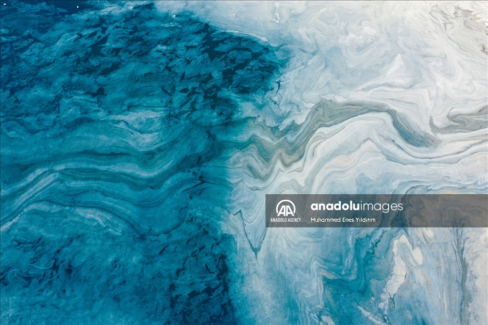 A drone photo shows an aerial view of increased mucilage level at Caddebostan shore in Istanbul, Turkey on June 15, 2021