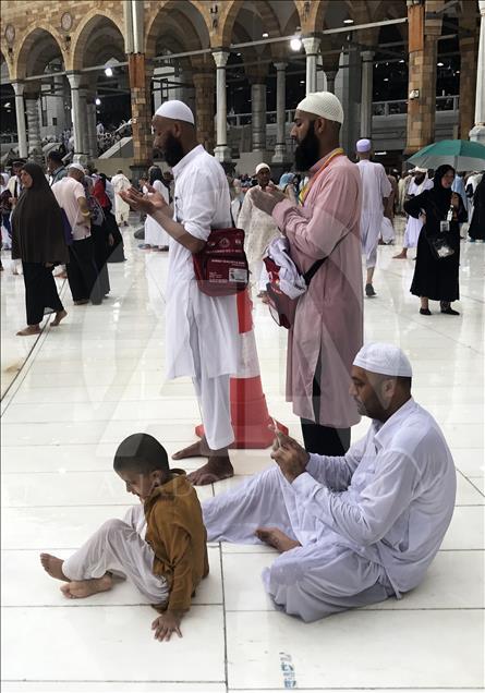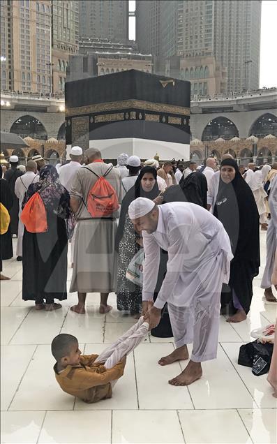 MECCA, SAUDI ARABIA - AUGUST 21: A man plays with his child as Muslim devotees circumambulate the Kaaba during rain in Mecca, Saudi Arabia on August 21, 2017. Muslim worshipers tried to collect water with their coifs and attires. Number of prospective pilgrims, those who arrived to Mecca, exceeded 1 million. Fırat Yurdakul