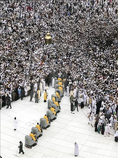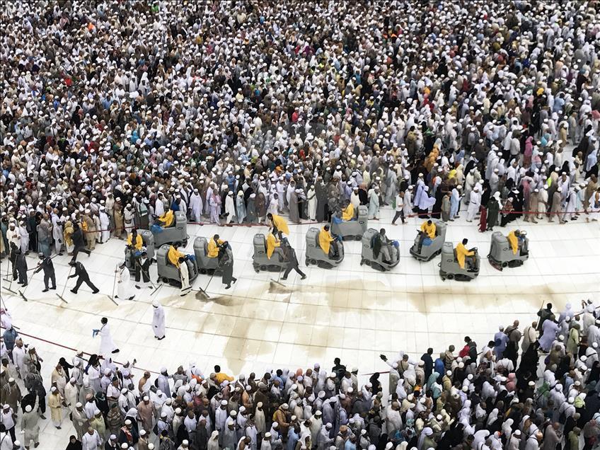 MECCA, SAUDI ARABIA - AUGUST 21: Cleaning personnel clean the ground as Muslim devotees circumambulate the Kaaba during rain in Mecca, Saudi Arabia on August 21, 2017. Muslim worshipers tried to collect water with their coifs and attires. Number of prospective pilgrims, those who arrived to Mecca, exceeded 1 million.Fırat Yurdakul
