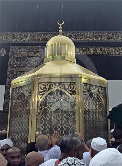 MECCA, SAUDI ARABIA - AUGUST 21: Muslim devotees pray in the Kaaba during rain in Mecca, Saudi Arabia on August 21, 2017. Muslim worshipers tried to collect water with their coifs and attires. Number of prospective pilgrims, those who arrived to Mecca, exceeded 1 million.Fırat Yurdakul