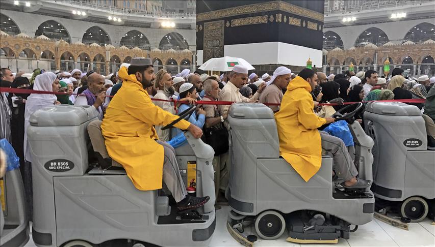 MECCA, SAUDI ARABIA - AUGUST 21: Cleaning personnel clean the ground as Muslim devotees circumambulate the Kaaba during rain in Mecca, Saudi Arabia on August 21, 2017. Muslim worshipers tried to collect water with their coifs and attires. Number of prospective pilgrims, those who arrived to Mecca, exceeded 1 million. Fırat Yurdakul