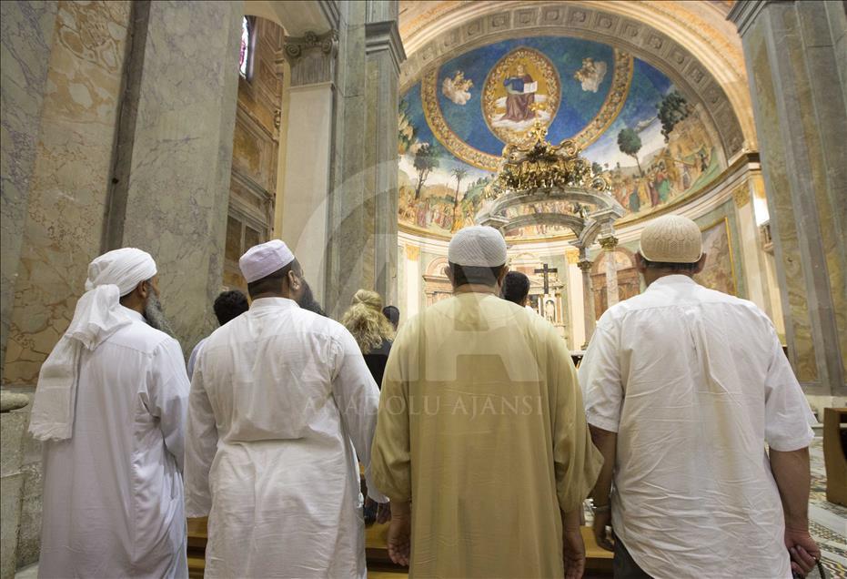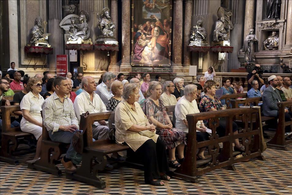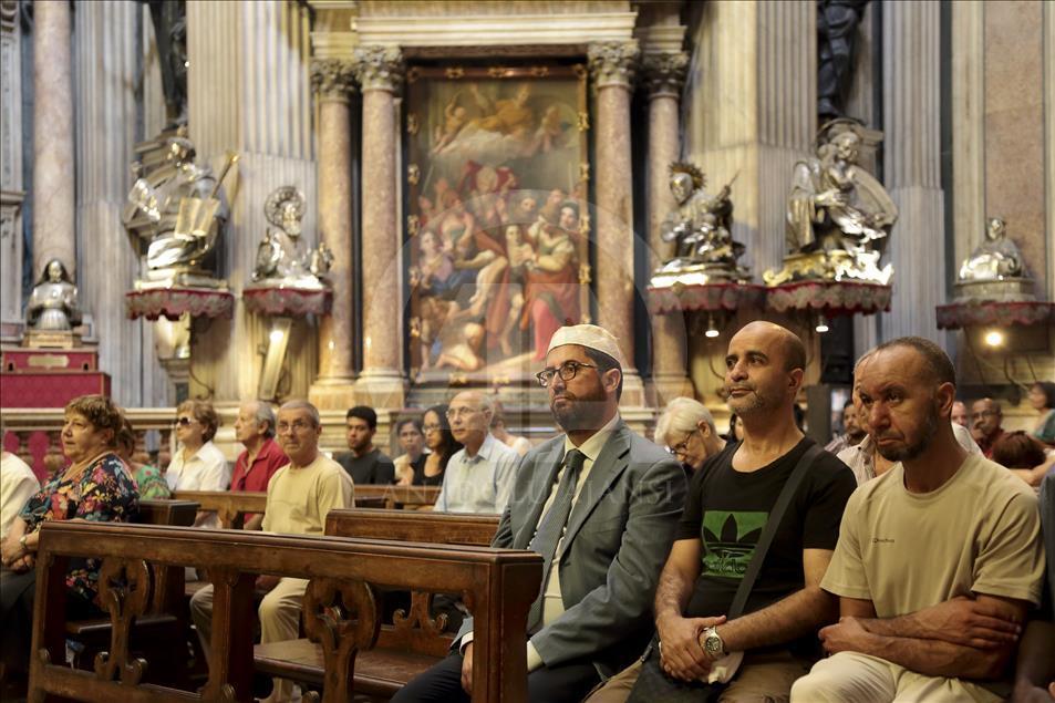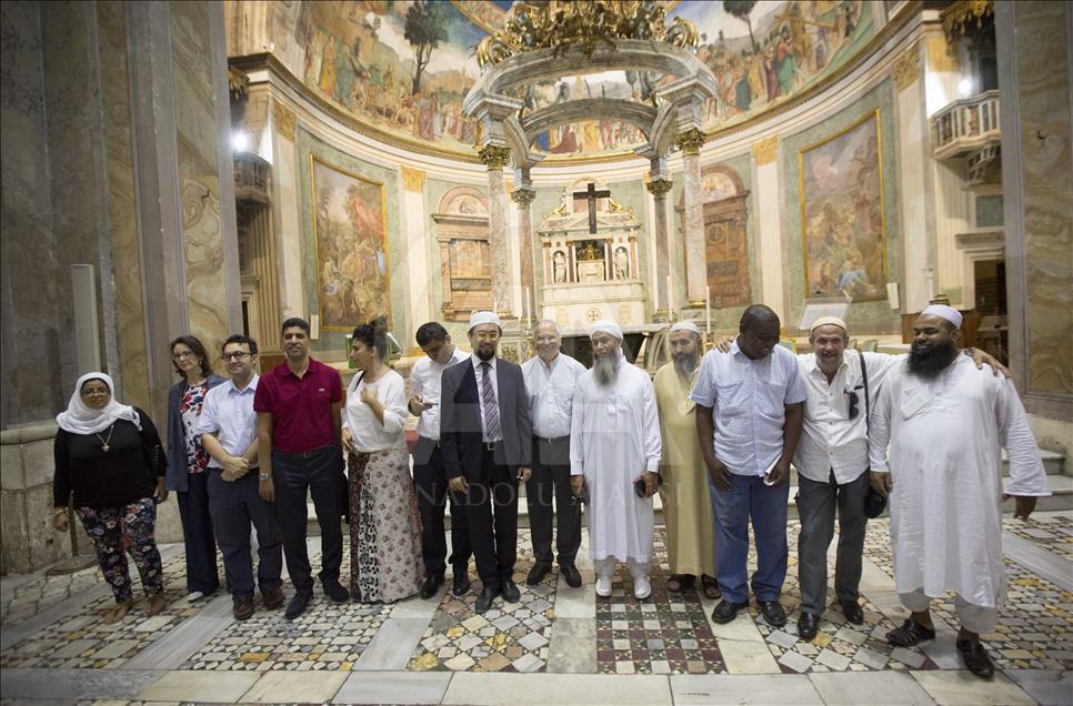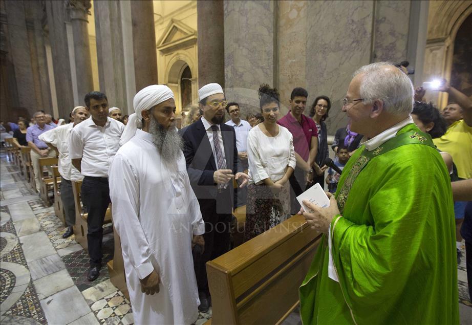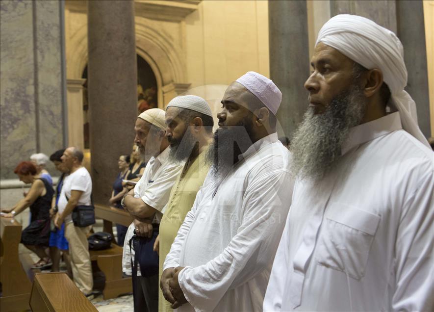 ROME, ITALY - JULY 31: Father Gino Amicarelli (C,) Imam Yahya Pallavicini (2nd L) and a Muslim delegation pose after a Sunday mass at Basilica of the Holy Cross in Jerusalem in Rome, Italy on July 31, 2016. Muslims and Christians attend Sunday mass for Father Jacques Hamel, who killed by the attackers who stormed the Catholic church in Sainte Etienne du Rouvray in Rouen.