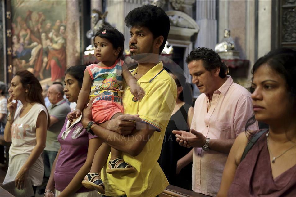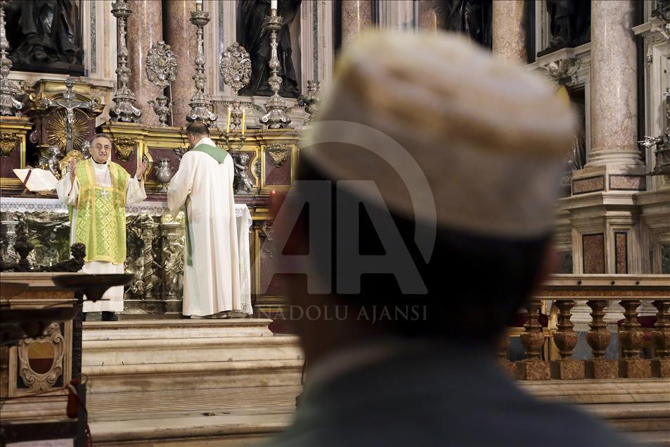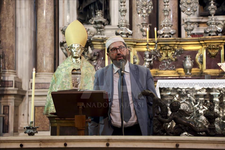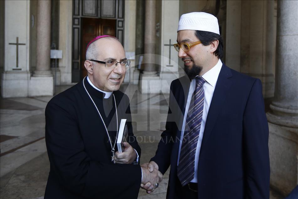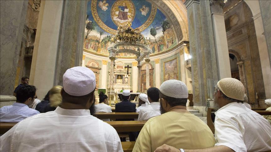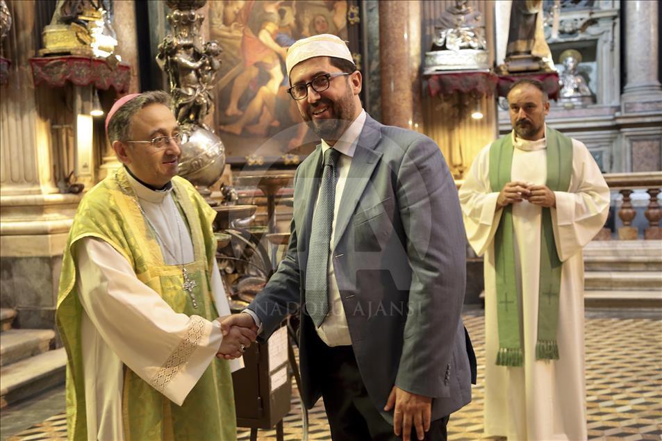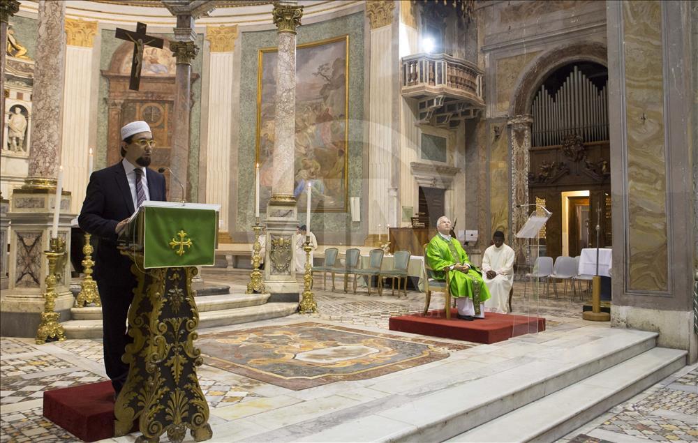 ROME, ITALY - JULY 31: Father Gino Amicarelli (C,) Imam Yahya Pallavicini (2nd L) and a Muslim delegation pose after a Sunday mass at Basilica of the Holy Cross in Jerusalem in Rome, Italy on July 31, 2016. Muslims and Christians attend Sunday mass for Father Jacques Hamel, who killed by the attackers who stormed the Catholic church in Sainte Etienne du Rouvray in Rouen.