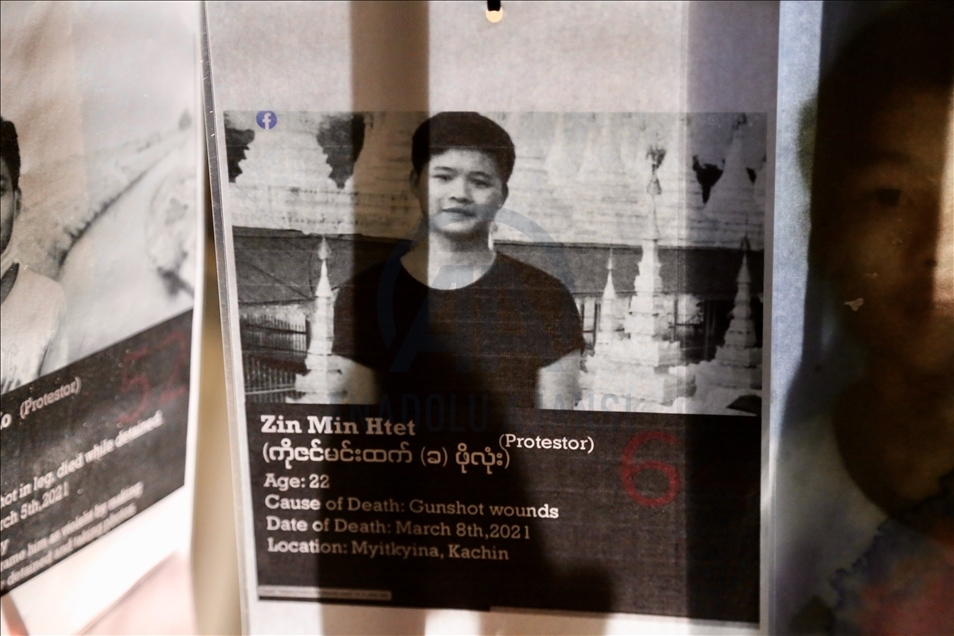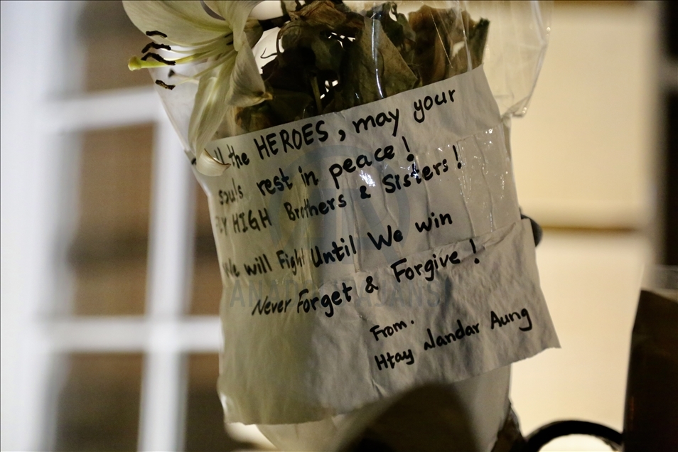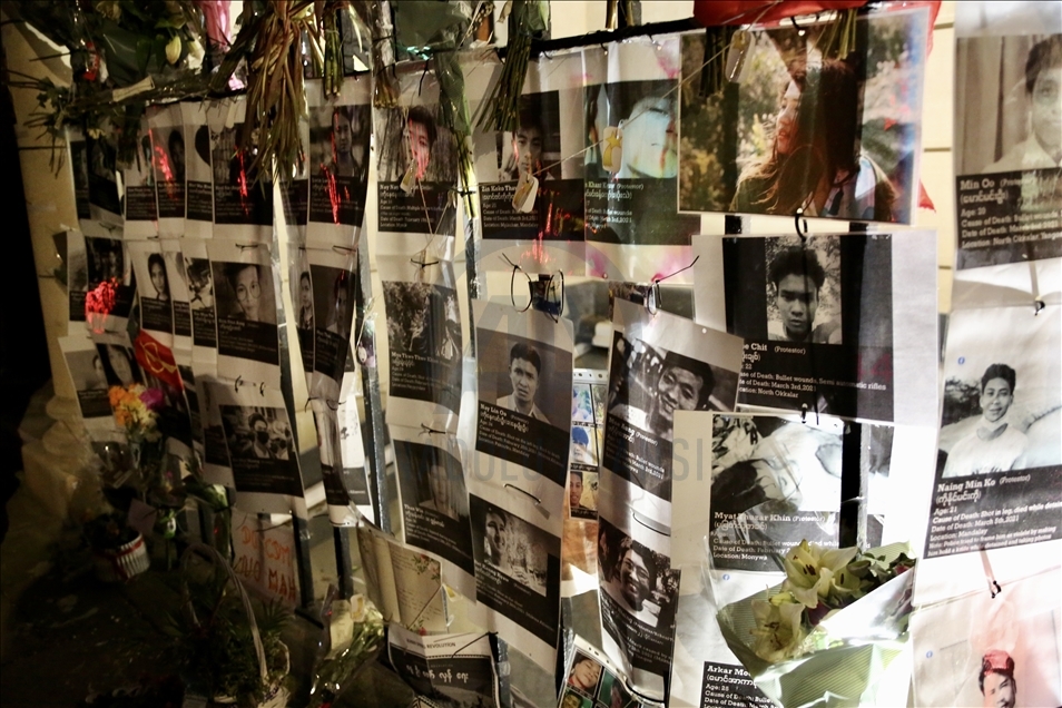 LONDON, UNITED KINGDOM - APRIL 08: Photos of people, who died during protests against military coup by Myanmarese security forces, in front of the embassy building of Myanmar after Myanmar's Ambassador to London, Kyaw Zwar Minn was prevented from entering the embassy building by the military attache following his announcement declaring that he does not support the military coup in his country, in London, United Kingdom on April 08, 2021. ( Hasan Esen - Anadolu Agency )Hasan Esen