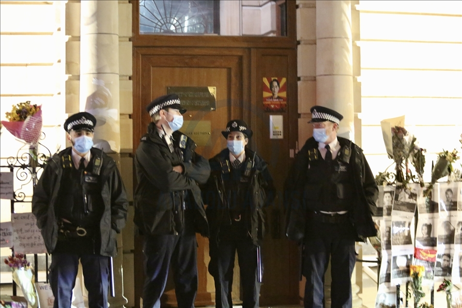 LONDON, UNITED KINGDOM - APRIL 08: Signs against military coup is seen in front of the embassy building of Myanmar after Myanmar's Ambassador to London, Kyaw Zwar Minn was prevented from entering the embassy building by the military attache following his announcement declaring that he does not support the military coup in his country, in London, United Kingdom on April 08, 2021. ( Hasan Esen - Anadolu Agency )Hasan Esen