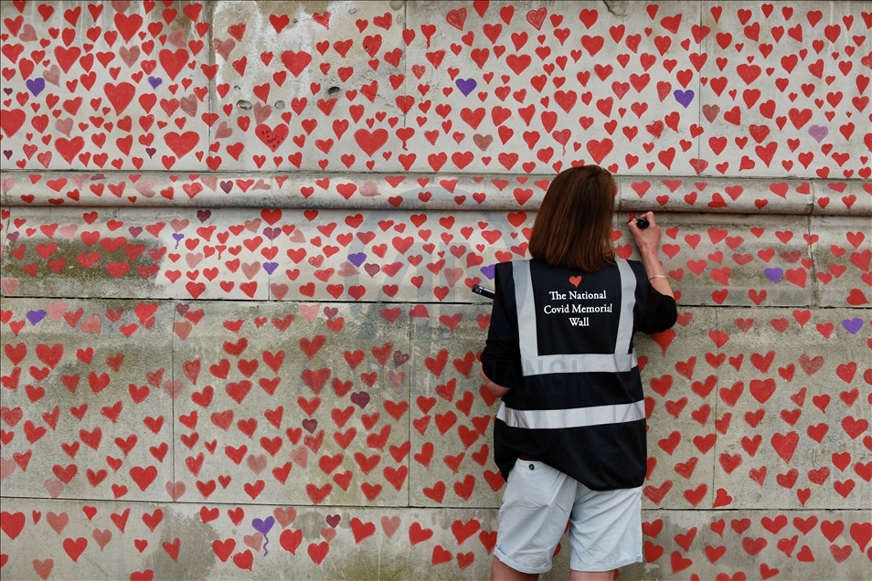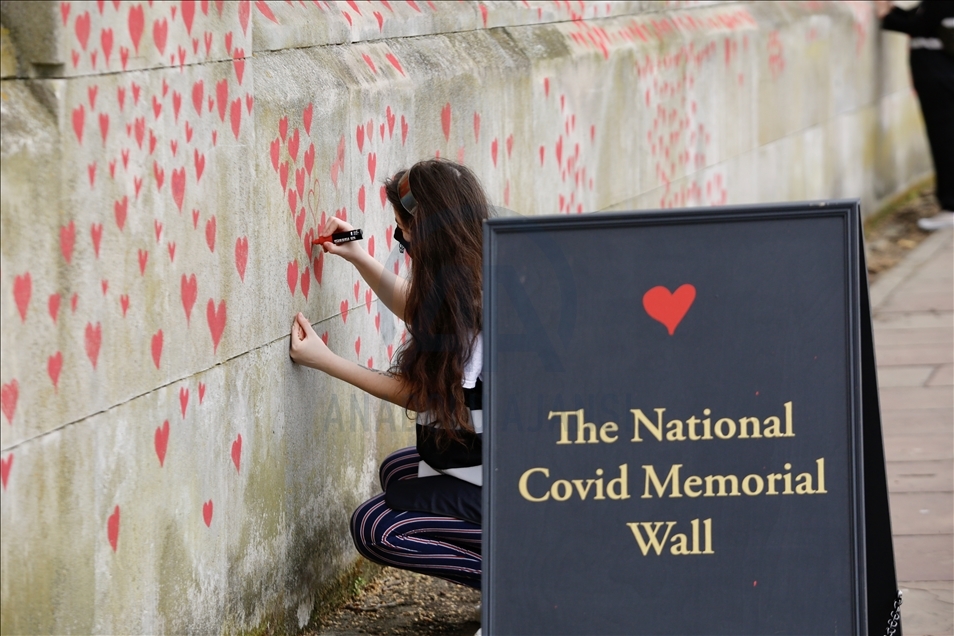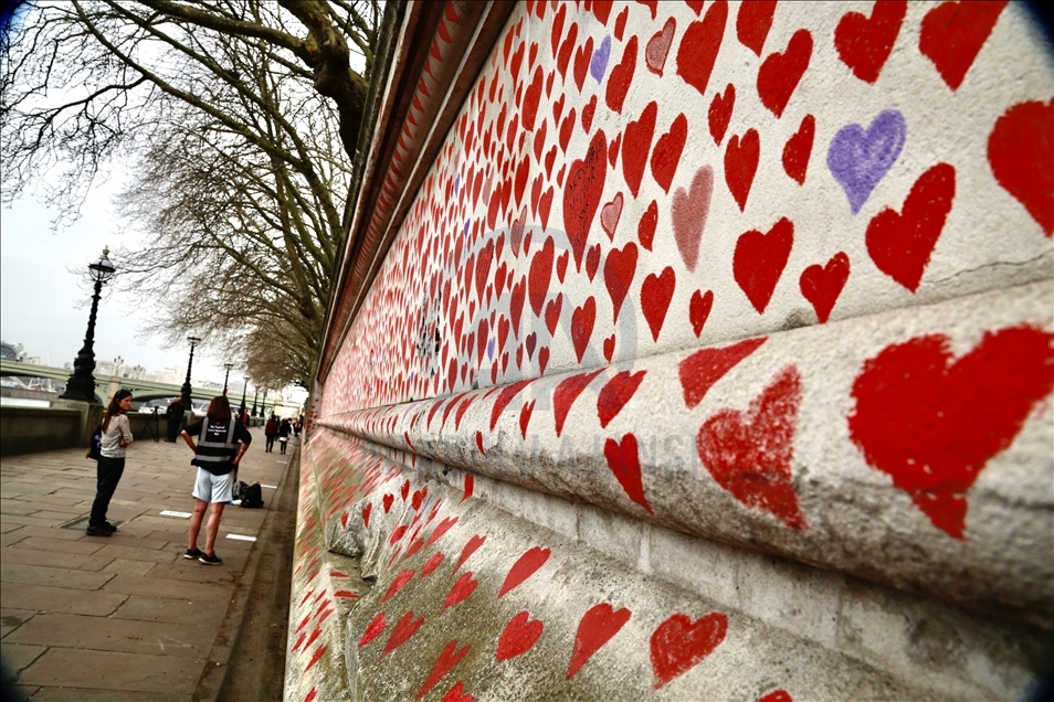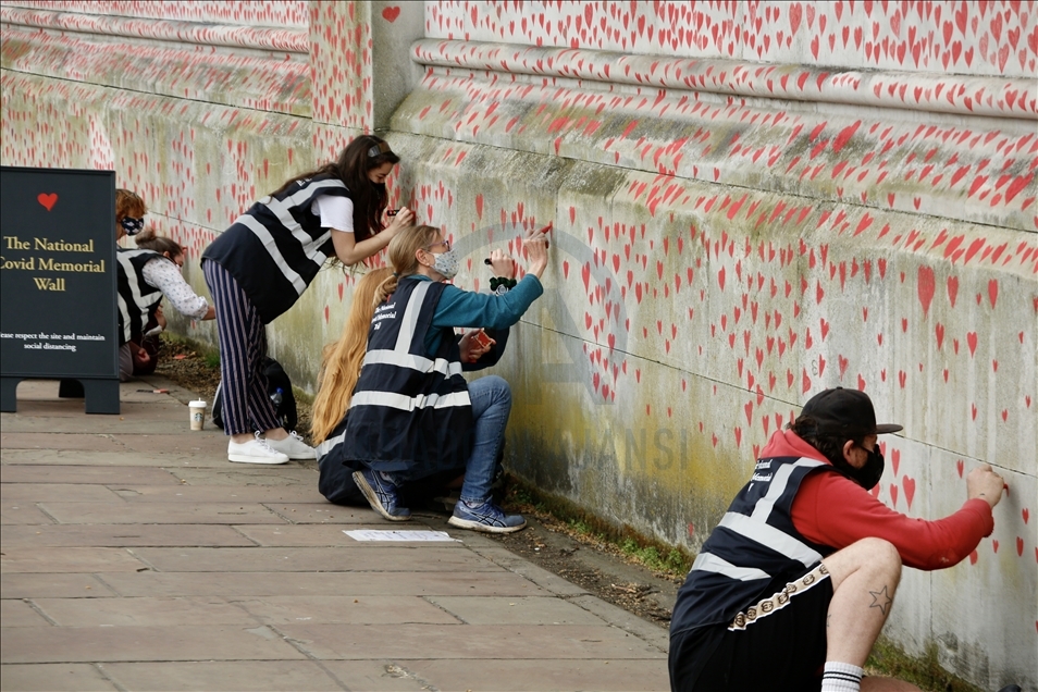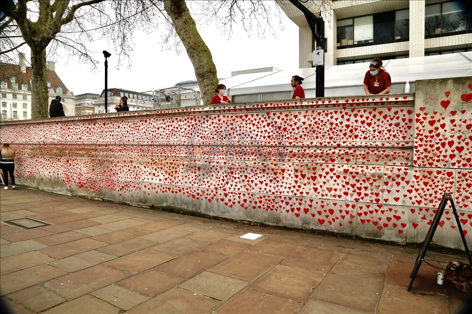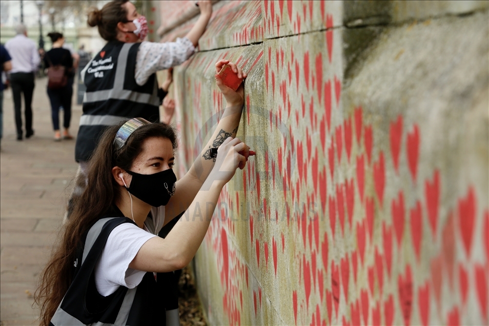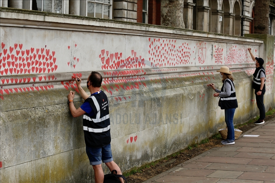 People paint red hearts representing the 150,000 victims who have died of the coronavirus (Covid-19), on the National Covid Memorial Wall, opposite the Houses of Parliament in London, United Kingdom on March 31, 2021.