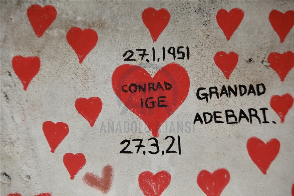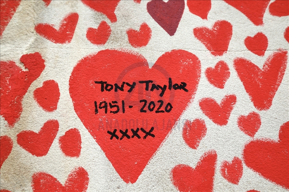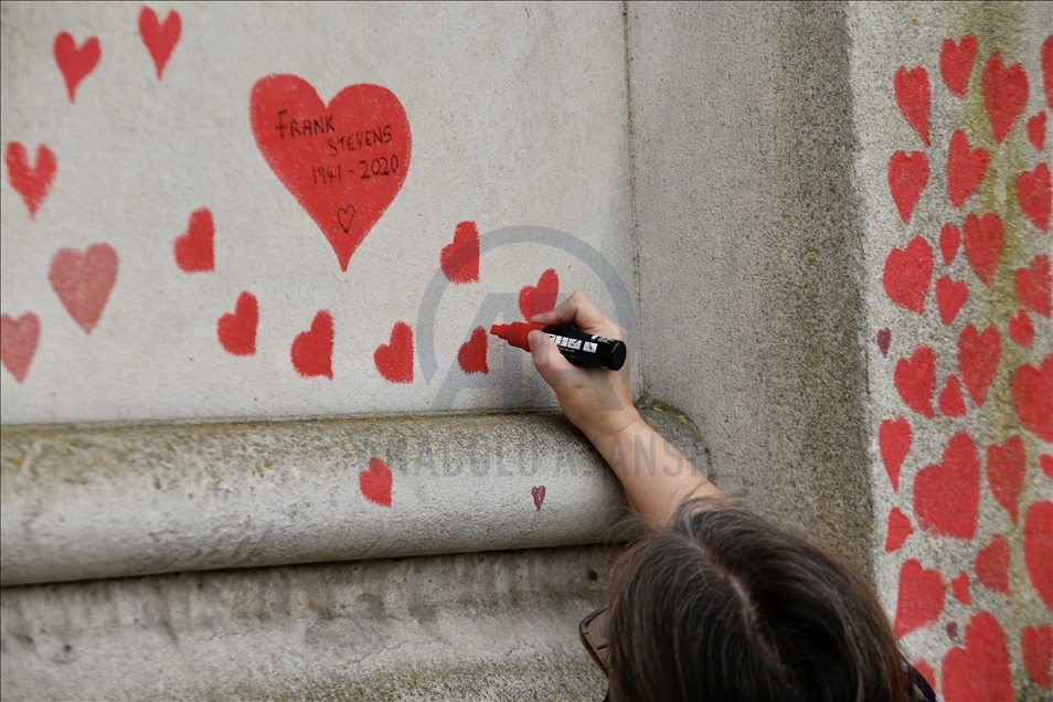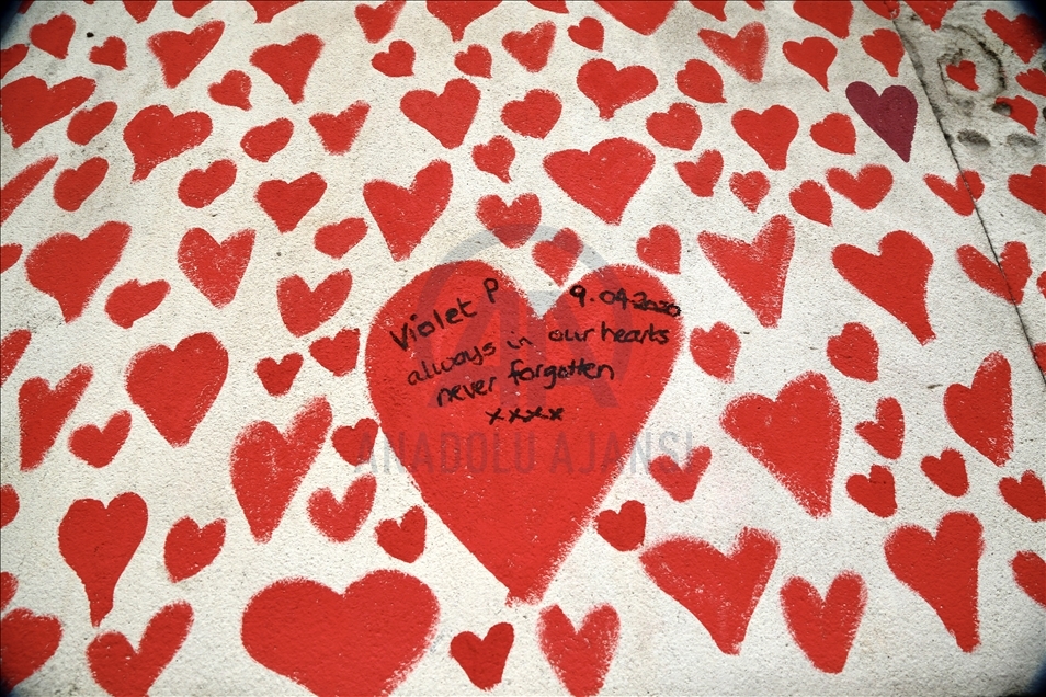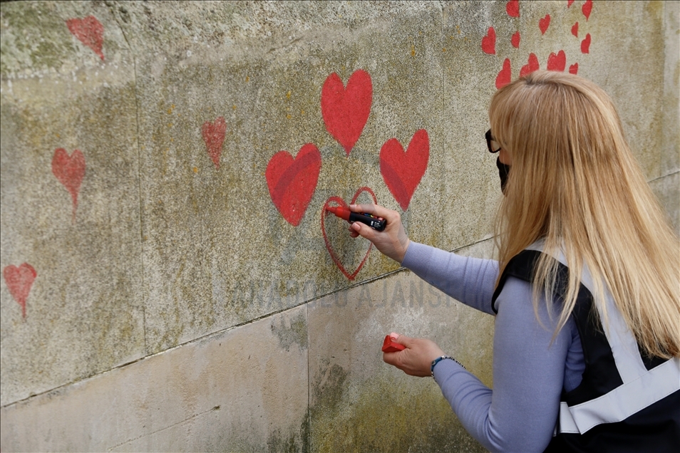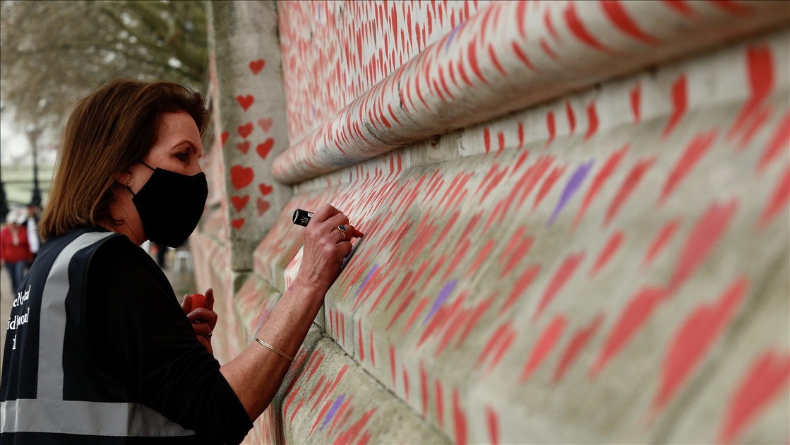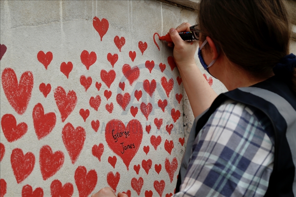 People paint red hearts representing the 150,000 victims who have died of the coronavirus (Covid-19), on the National Covid Memorial Wall, opposite the Houses of Parliament in London, United Kingdom on March 31, 2021.
