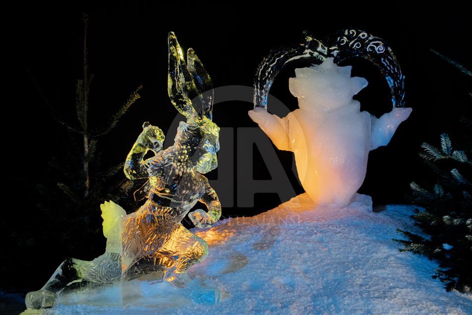 The sculptures of the Snow Country animation characters are being exhibited at the Ice Sculpture Festival in the Hague, Netherlands