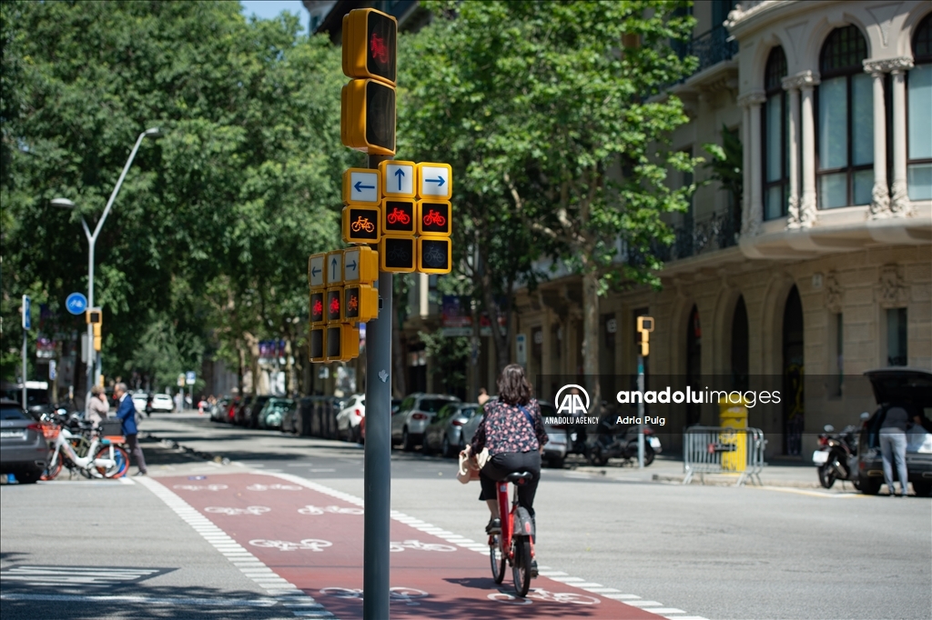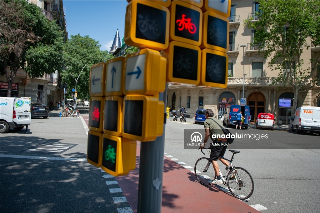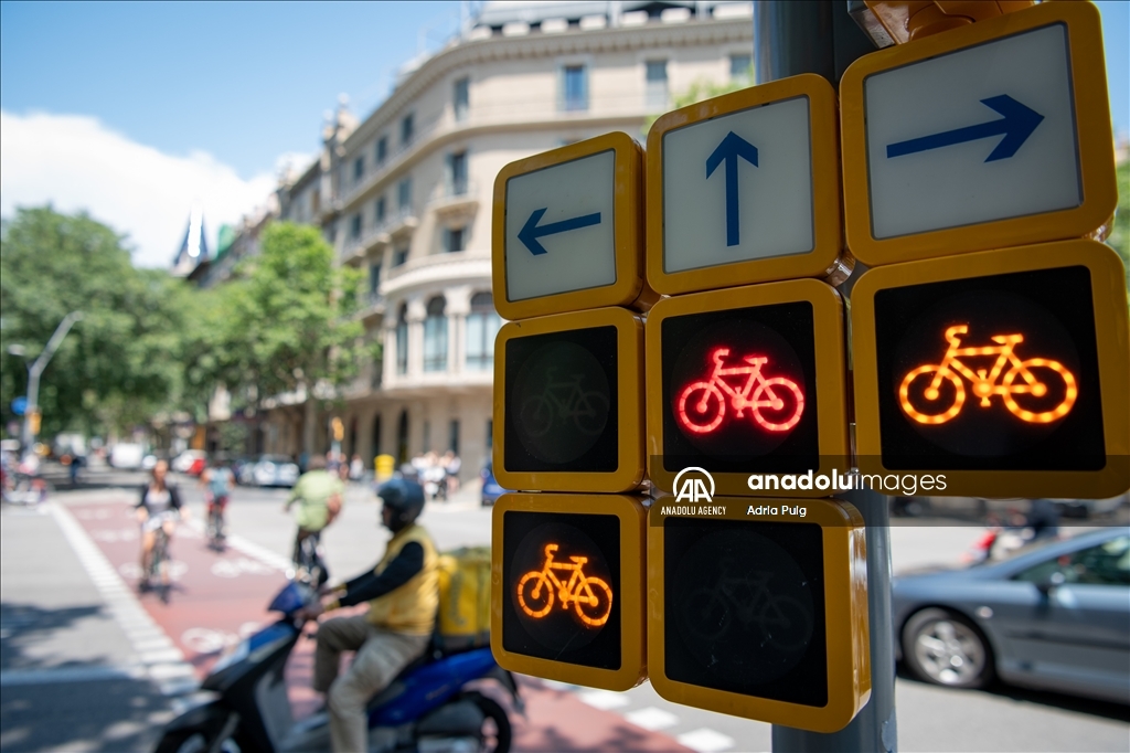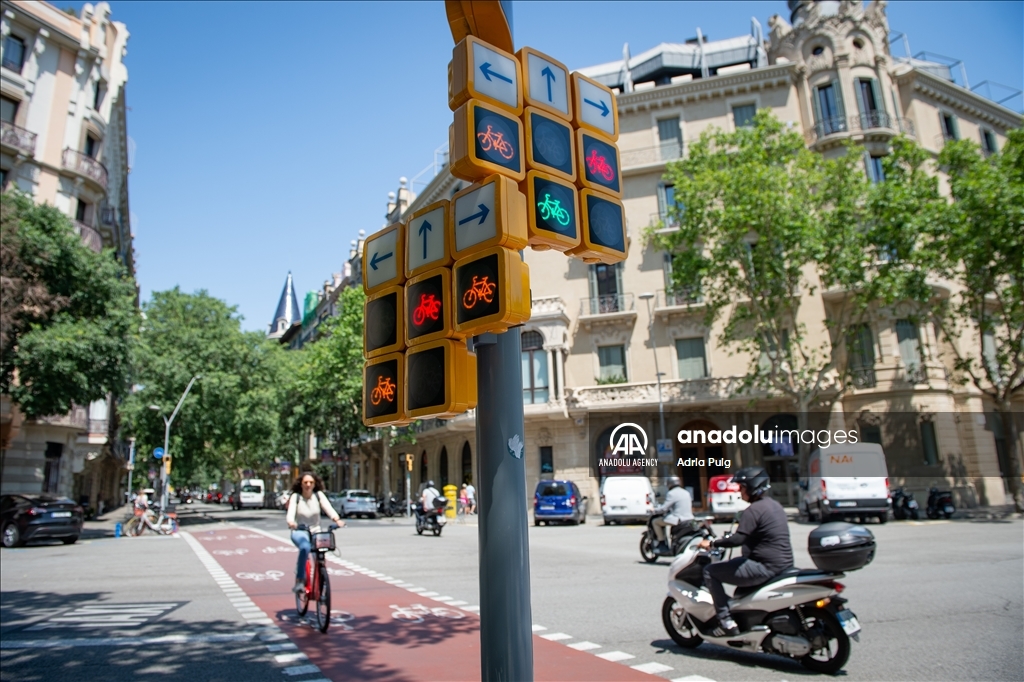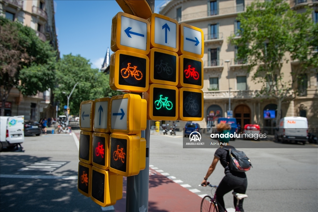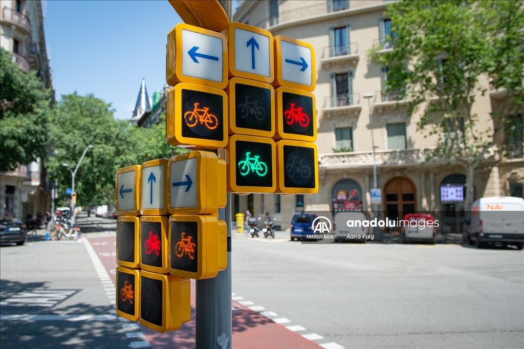 BARCELONA, SPAIN - MAY 24: A view of the new traffic light system which begins to operate on a new section of the cycle lane at a crossroad during the sunny day in Barcelona, Spain on May 24, 2023. ( Adria Puig - Anadolu Agency )Adria Puig