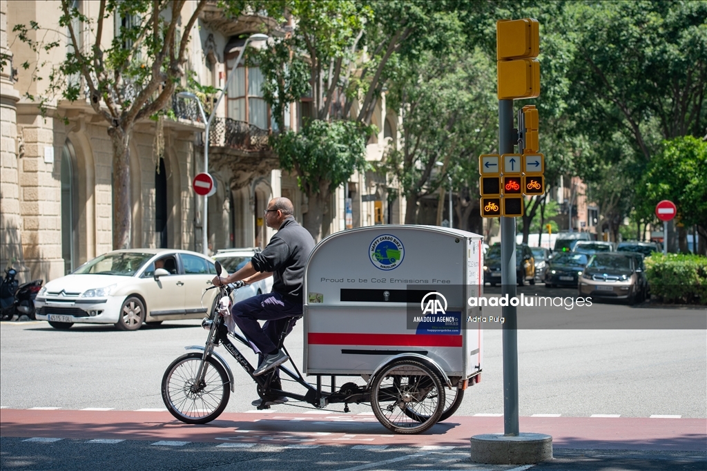 BARCELONA, SPAIN - MAY 24: A man with a cargo bike passes by the new traffic light system which begins to operate on a new section of the cycle lane at a crossroad during the sunny day in Barcelona, Spain on May 24, 2023. ( Adria Puig - Anadolu Agency )Adria Puig