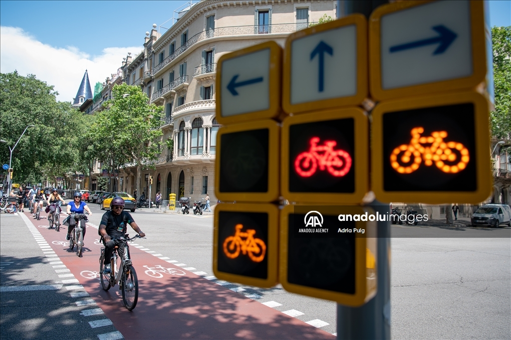 BARCELONA, SPAIN - MAY 24: Riders pass by the new traffic light system which begins to operate on a new section of the cycle lane at a crossroad during the sunny day in Barcelona, Spain on May 24, 2023. ( Adria Puig - Anadolu Agency )Adria Puig