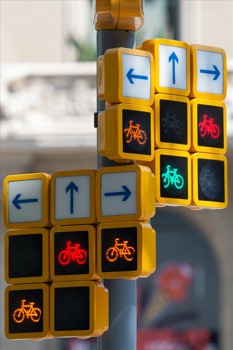 BARCELONA, SPAIN - MAY 24: A view of the new traffic light system which begins to operate on a new section of the cycle lane at a crossroad during the rush hour in Barcelona, Spain on May 24, 2023. ( Adria Puig - Anadolu Agency )Adria Puig