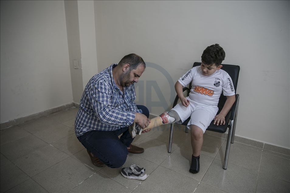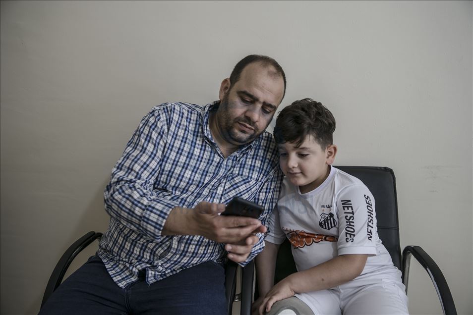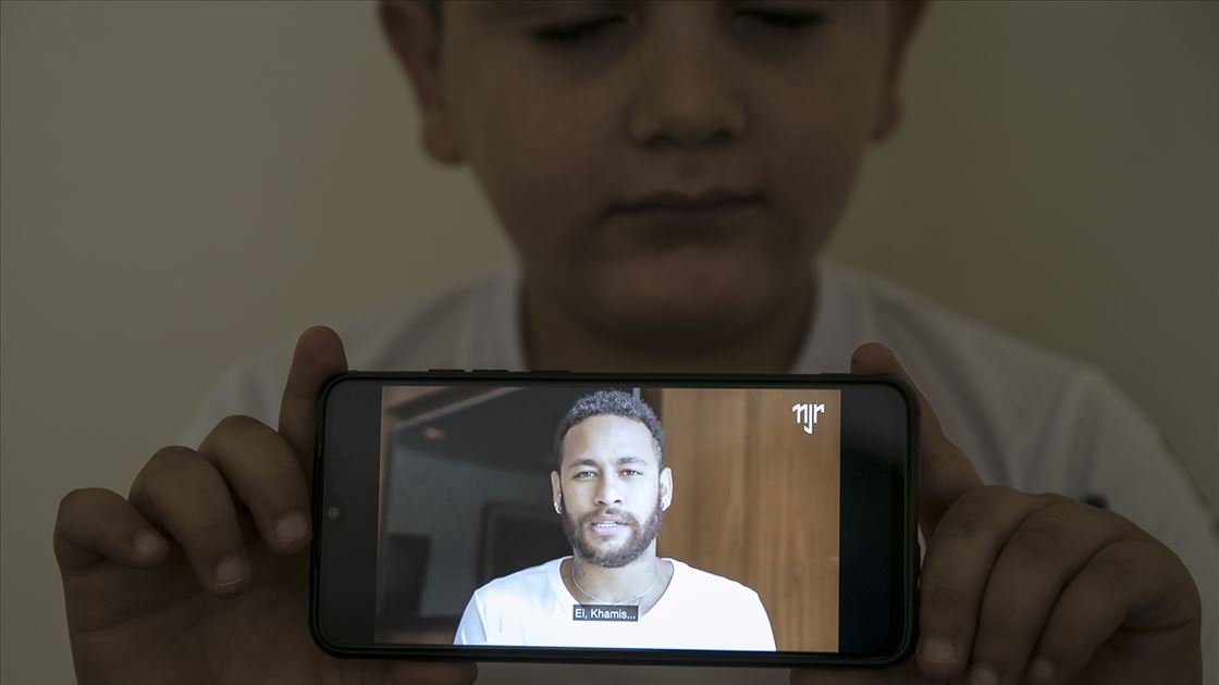 Hamis al Gacir, 8-year-old Syrian boy who lost his right leg in an airstrike in Syria, watches the Brazilian striker Neymar Jr.'s video message of support, in Hatay, Turkey on May 3, 2020.