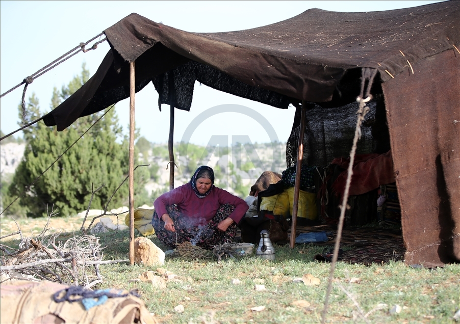MERSIN, TURKEY - MAY 04: Nomad Hatice Ucar, 61, (C) and her spouse Ali Ucar, 63, (L) are seen at a tent with their cave flock as they and nomads are on their way to cooler uplands to Konya and Karaman districts at spring season in Mersin, Turkey on May 04, 2021. ( Sezgin Pancar - Anadolu Agency )Sezgin Pancar