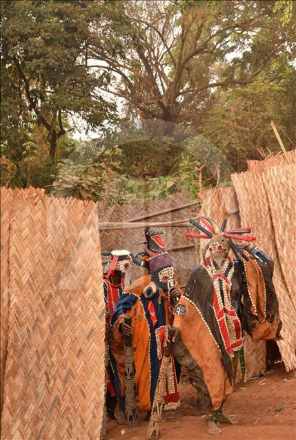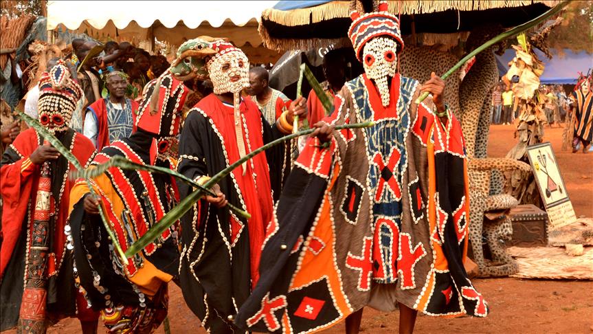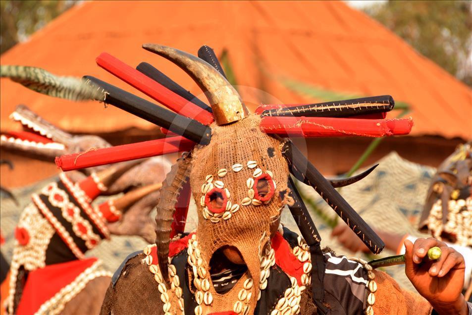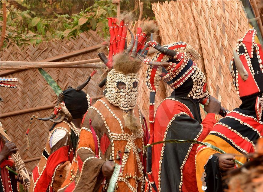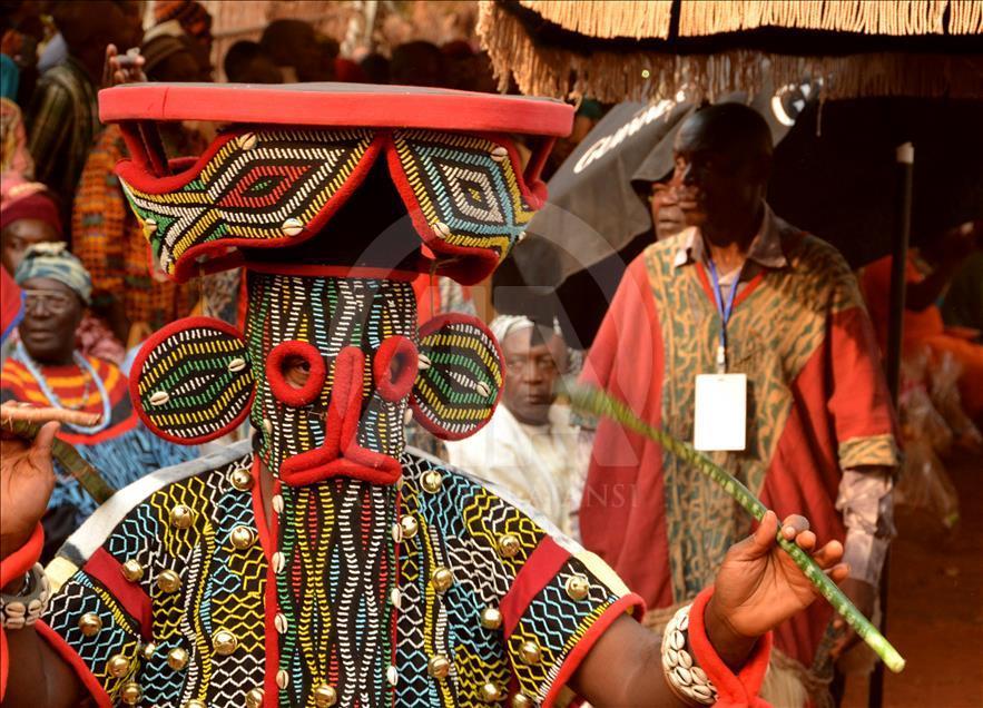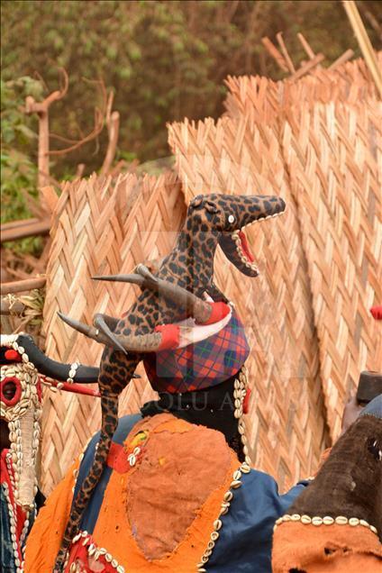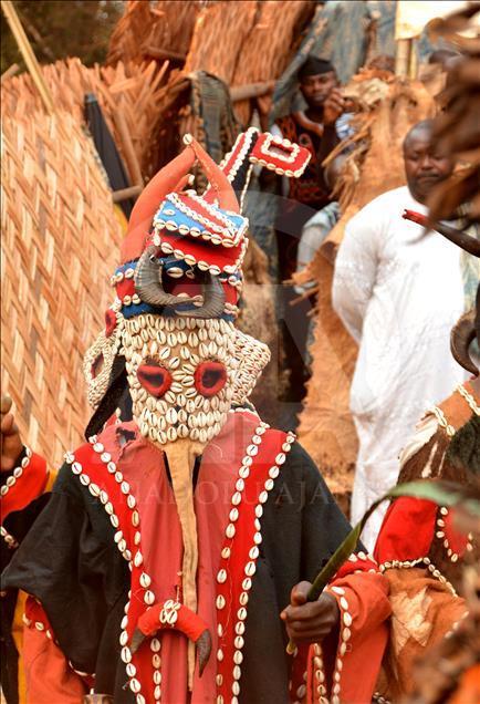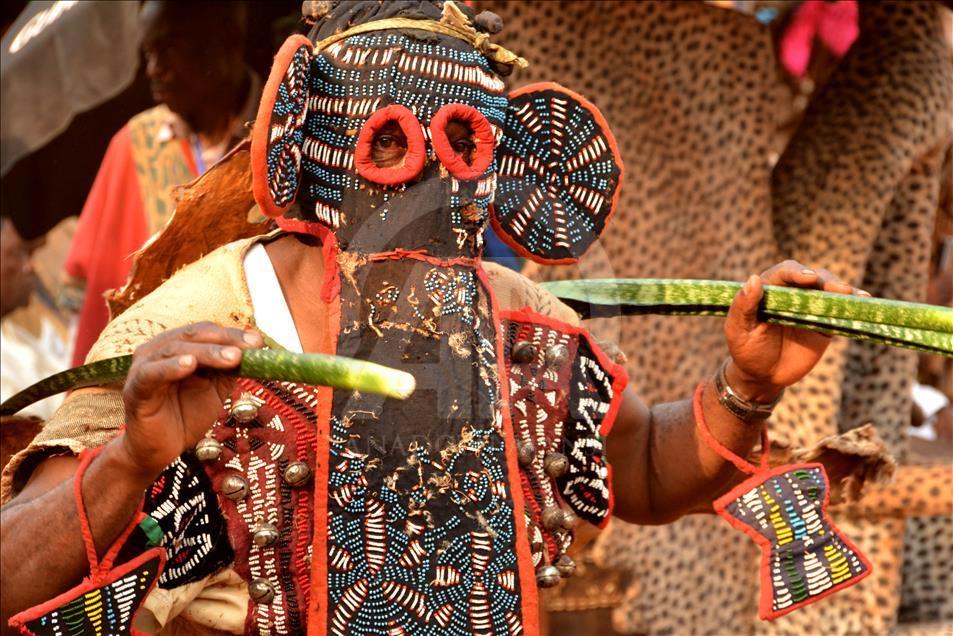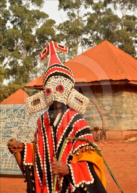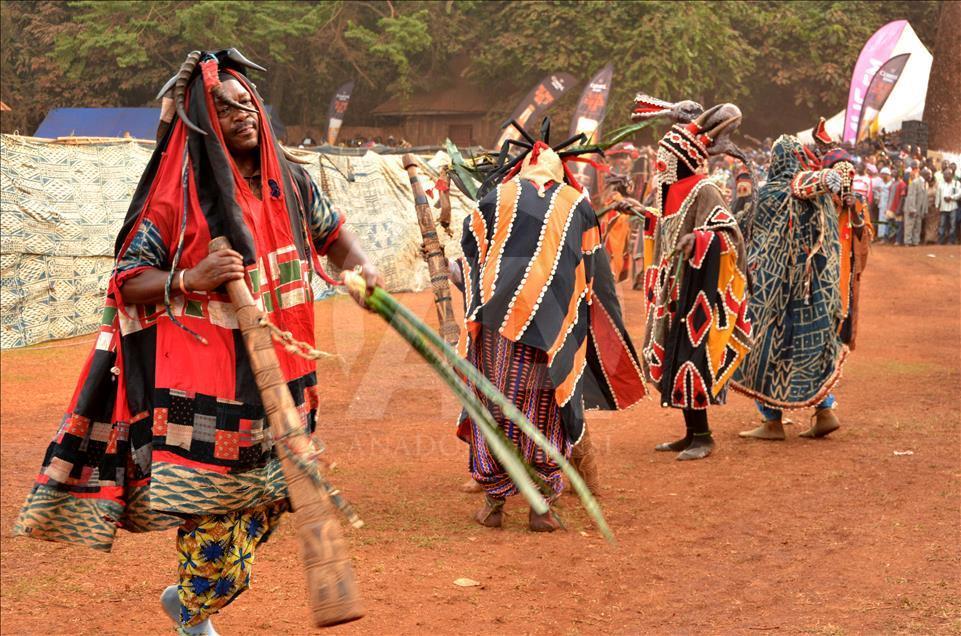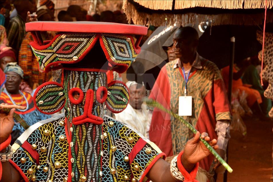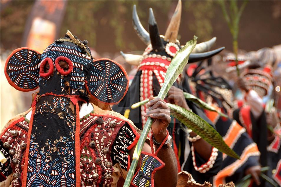 BAFOUSSAM, CAMEROON - FEBRUARY 26: The Bamilekes march on the streets of the town to music and dancing during the Nyang Nyang dance festival in Bafoussam, Cameroon on February 26, 2017. The Nyang Nyang dance festival, held once every two years by the Bamileke ethnic group from the west of Cameroon, took place this year in the town of Bafoussam with traditional masks and clothing. The Nyang Nyang festival, which is one of Africa's oldest carnivals, is seen as a show of strength by the Bamilekes.