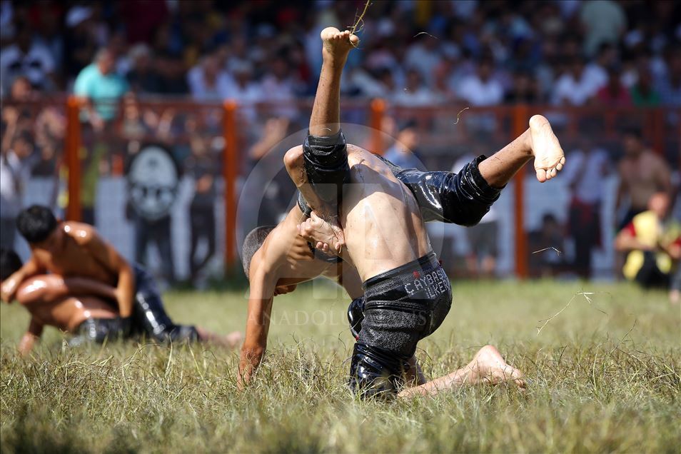 EDIRNE, TURKEY - JULY 07: Young wrestlers compete on the last day of the 658th annual Kirkpinar Oil Wrestling Festival in Edirne, Turkey on July 07, 2019. The Kirkpinar Oil Wrestling Festival, is one of the world’s oldest sports events and has been held annually in the province since 1362, with wrestlers engaging in a physical and mental struggle without the use of any equipment.