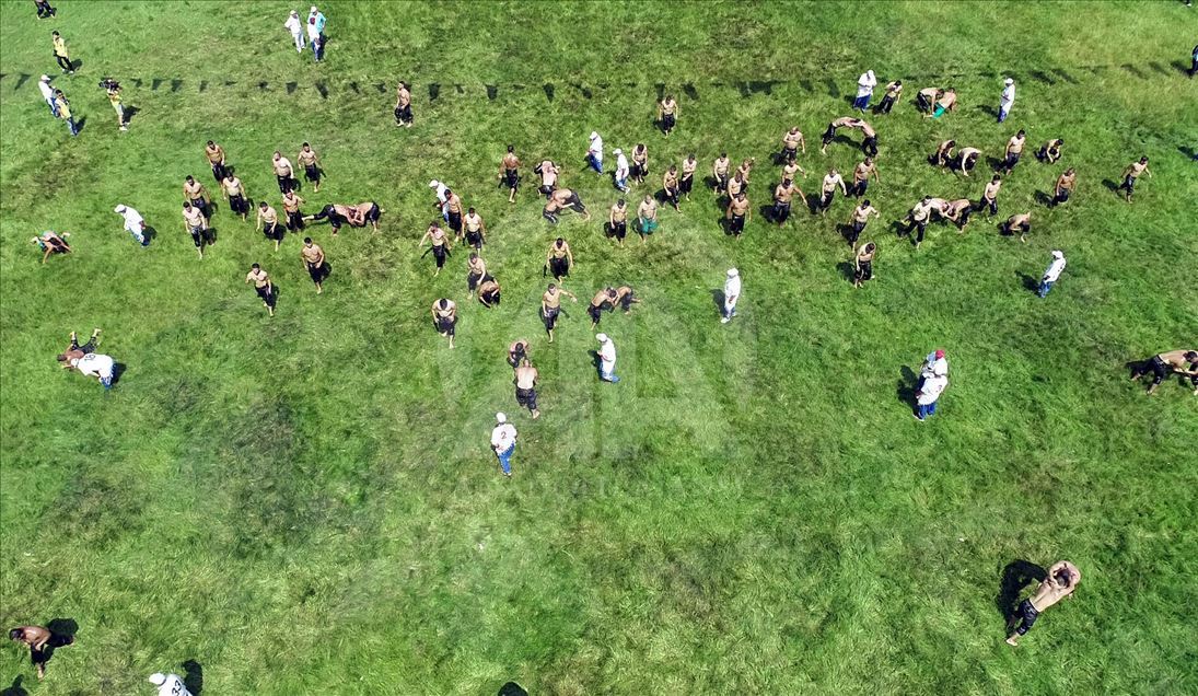 EDIRNE, TURKEY - JULY 06: Wrestlers compete on the second day of the 658th annual Kirkpinar Oil Wrestling Festival held in Sarayici near Edirne, Turkey on July 06, 2019. The Kirkpinar Oil Wrestling Festival, is one of the world’s oldest sports events and has been held annually in the province since 1362, with wrestlers engaging in a physical and mental struggle without the use of any equipment.