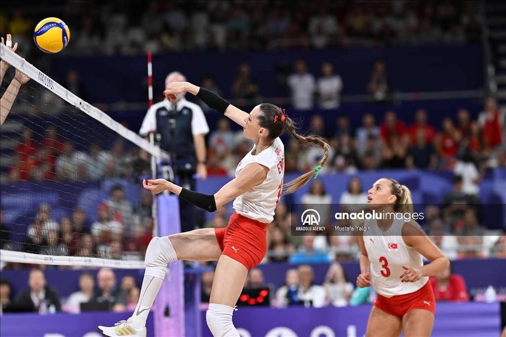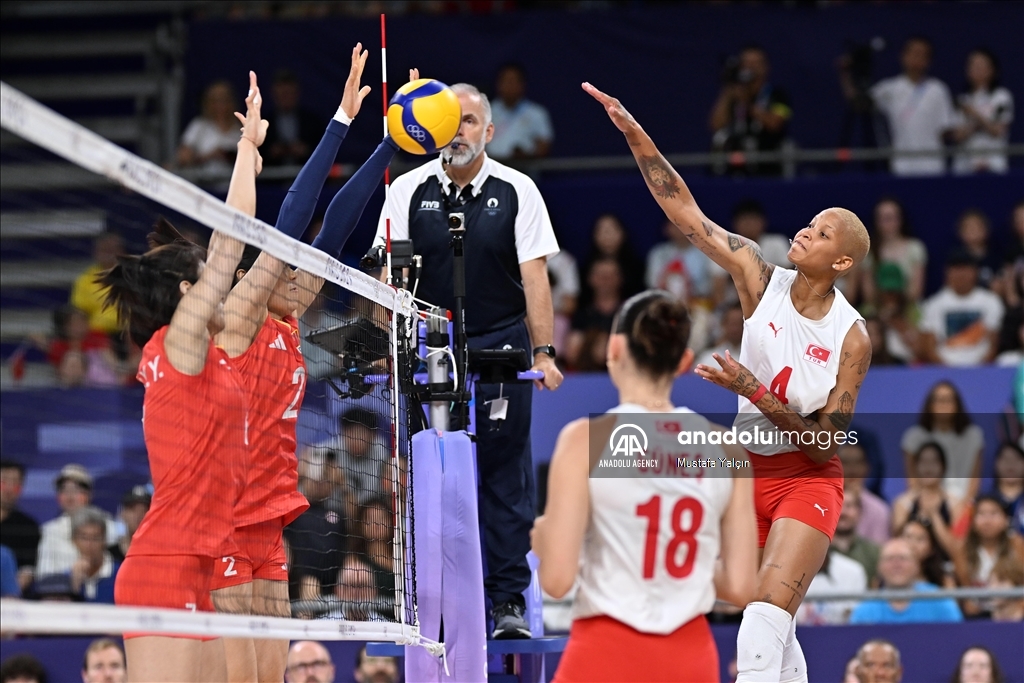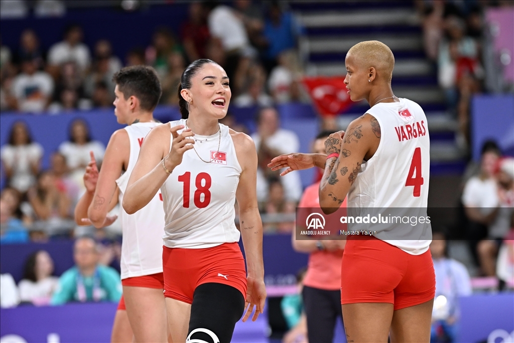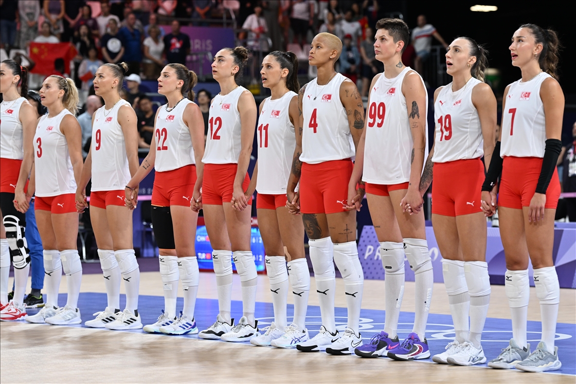 Players of Turkiye line up during national anthem ahead of the volleyball women's quarter-final match between China and Turkiye on day eleven of the Olympic Games Paris 2024 at the South Paris Arena 1 in Paris, France