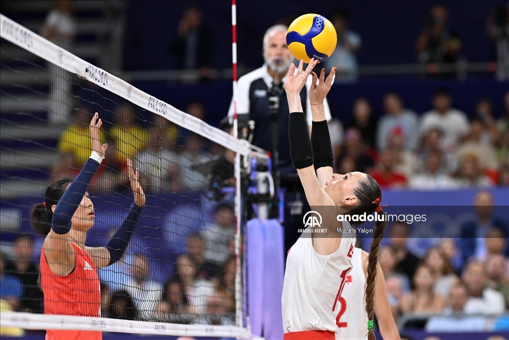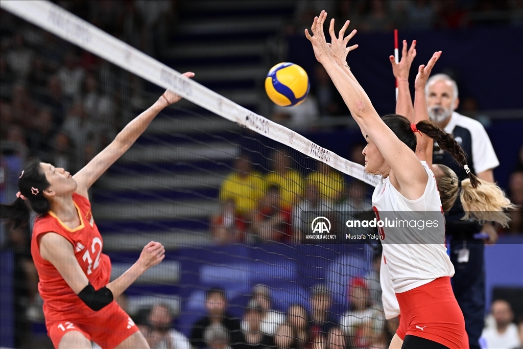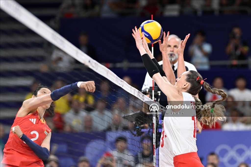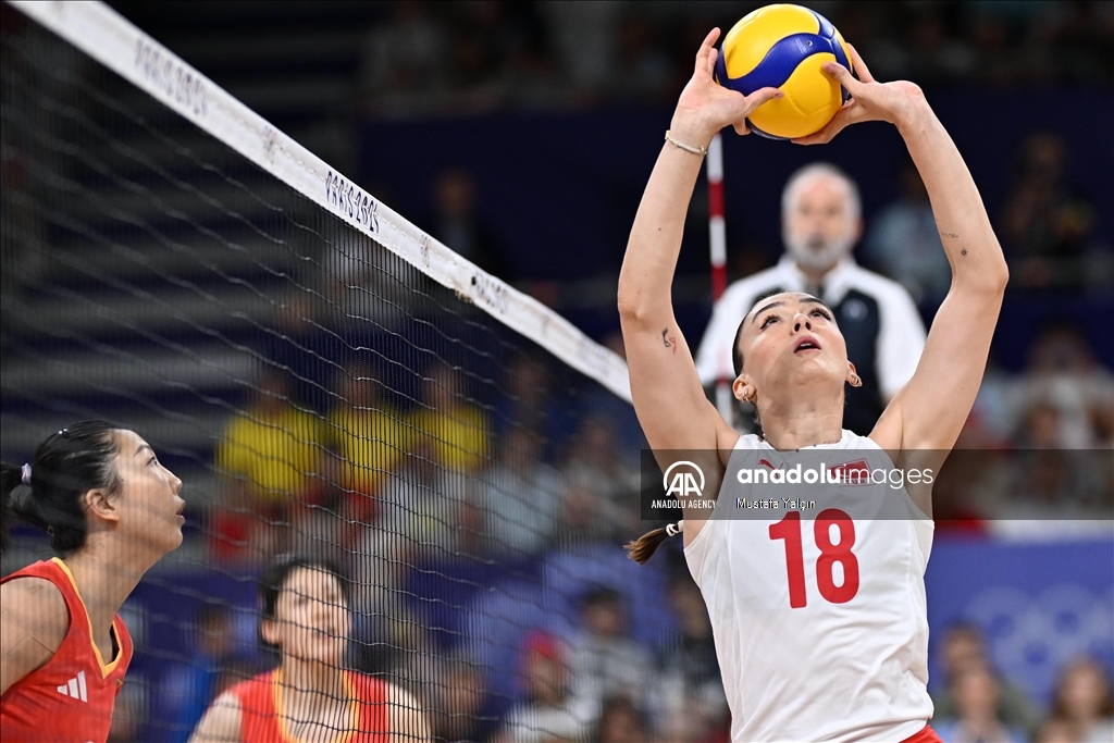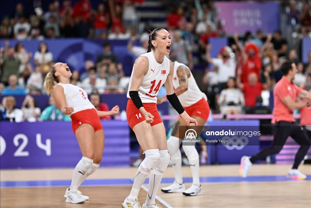 Players of Turkiye line up during national anthem ahead of the volleyball women's quarter-final match between China and Turkiye on day eleven of the Olympic Games Paris 2024 at the South Paris Arena 1 in Paris, France