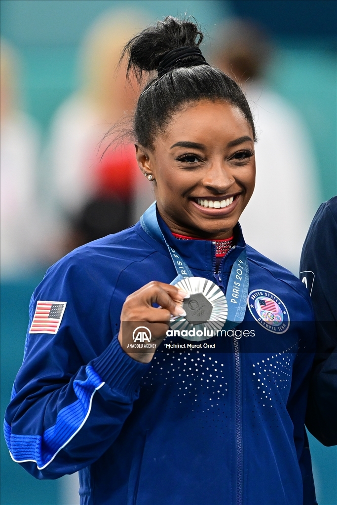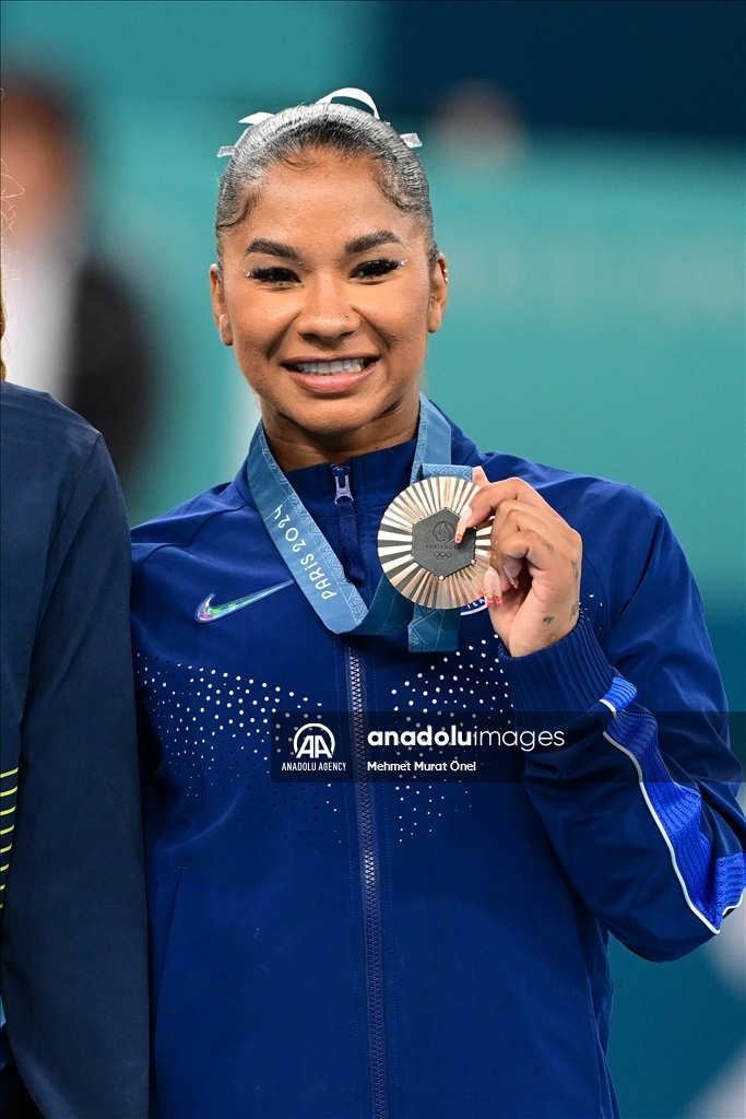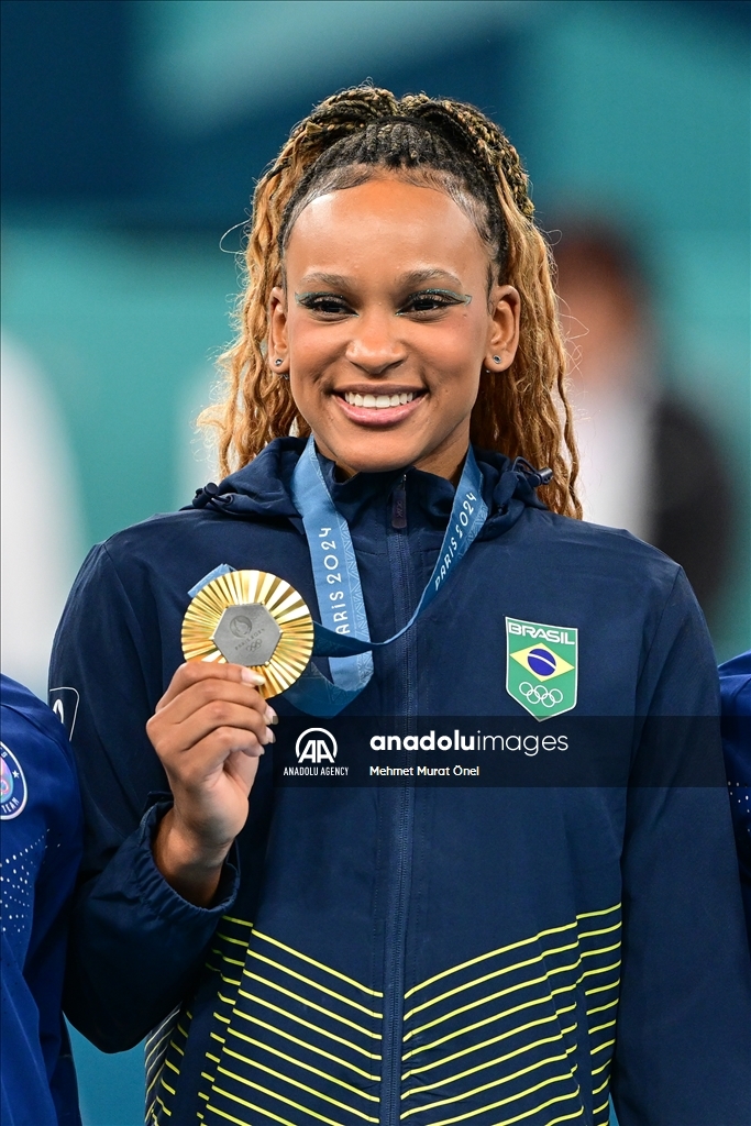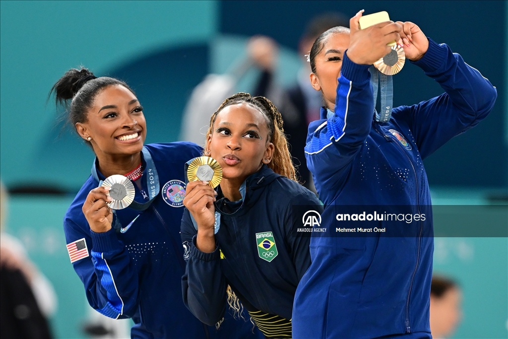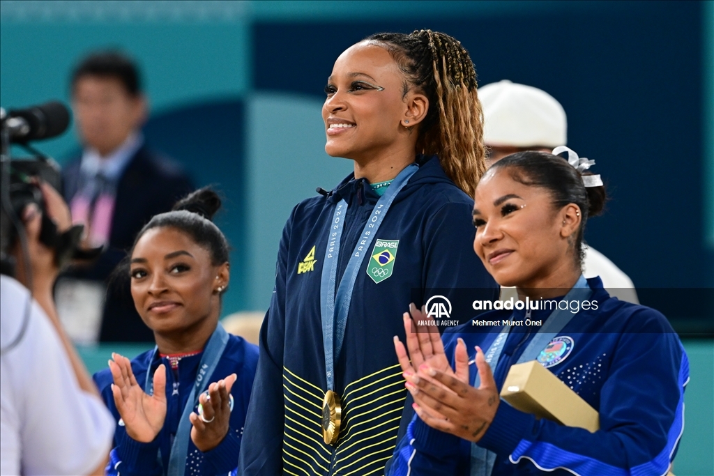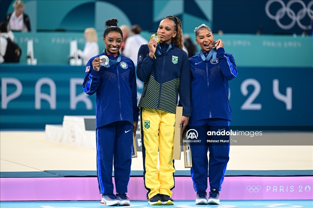 Gold medalist Rebeca Andrade (C) of Team Brazil, silver medalist Simone Biles (L) of Team United States and bronze medalist Jordan Chiles (R) of Team United States celebrate on the podium at the Artistic Gymnastics Women's Floor Exercise Medal Ceremony on day ten of the Olympic Games Paris 2024 at Bercy Arena on August 05, 2024