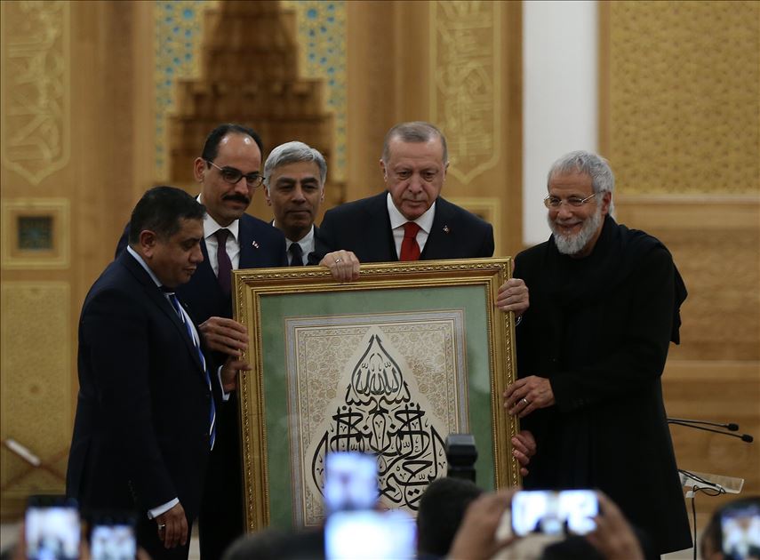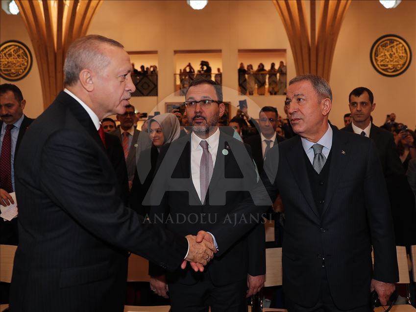 LONDON, ENGLAND - DECEMBER 5: (----EDITORIAL USE ONLY – MANDATORY CREDIT - "TURKISH PRESIDENCY / MURAT CETINMUHURDAR / HANDOUT" - NO MARKETING NO ADVERTISING CAMPAIGNS - DISTRIBUTED AS A SERVICE TO CLIENTS----) Turkish President Recep Tayyip Erdogan attends official opening ceremony of Cambridge Central Mosque in London, United Kingdom on December 5, 2019. Turkish Defense Minister Hulusi Akar (R) and Turkish Youth and Sports Minister Mehmet Muharrem Kasapoglu (C) also attended the opening ceremony. ( Turkish Presidency / Murat Cetinmuhurdar / Handout - Anadolu Agency )Turkish Presidency / Murat Cetinmuhurdar / Handout