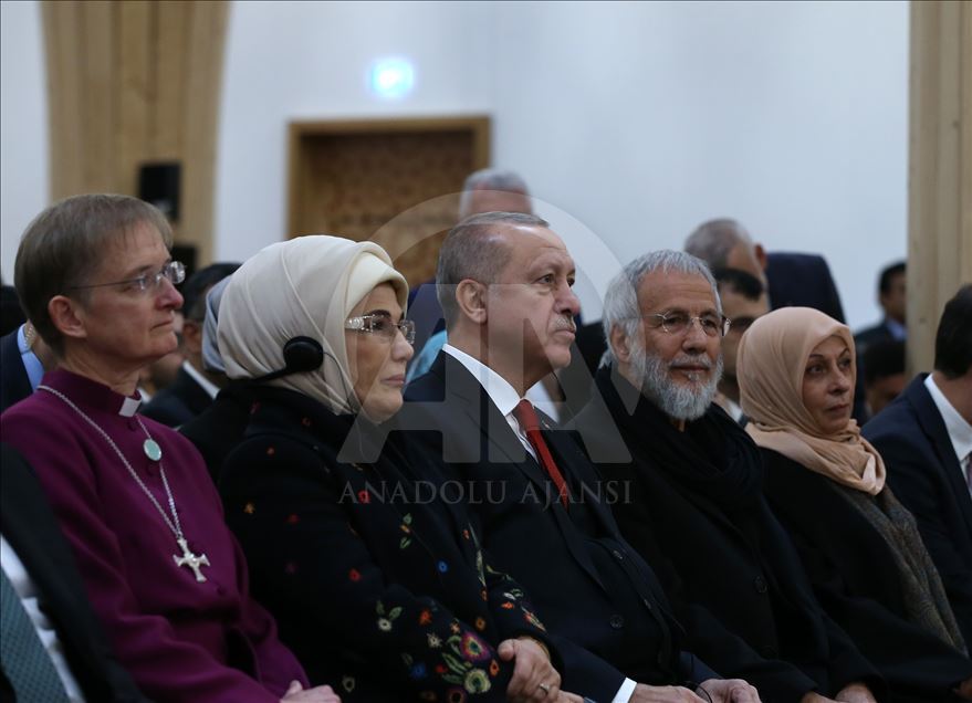 LONDON, ENGLAND - DECEMBER 5: (----EDITORIAL USE ONLY – MANDATORY CREDIT - "TURKISH PRESIDENCY / MURAT CETINMUHURDAR / HANDOUT" - NO MARKETING NO ADVERTISING CAMPAIGNS - DISTRIBUTED AS A SERVICE TO CLIENTS----) Turkish President Recep Tayyip Erdogan (2nd R) attends official opening ceremony of Cambridge Central Mosque in London, United Kingdom on December 5, 2019. ( TURKISH PRESIDENCY / MURAT CETINMUHURDAR / HANDOUT - Anadolu Agency )TURKISH PRESIDENCY / MURAT CETINMUHURDAR / HANDOUT