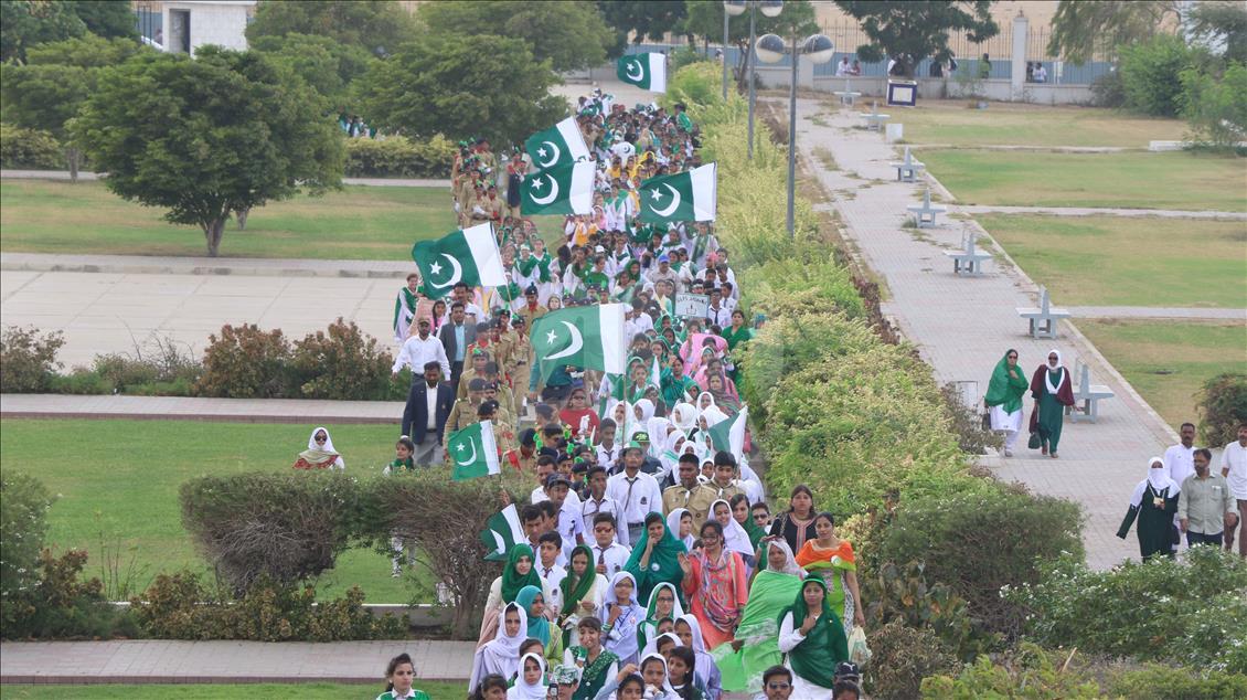 KARACHI, PAKISTAN - AUGUST 14: Pakistani students carry national flag at the mausoleum of the founder of Pakistan Muhammad Ali Jinnah during a ceremony to mark the country’s Independence Day in Karachi, Pakistan on August 14, 2017. Sabir Mazhar