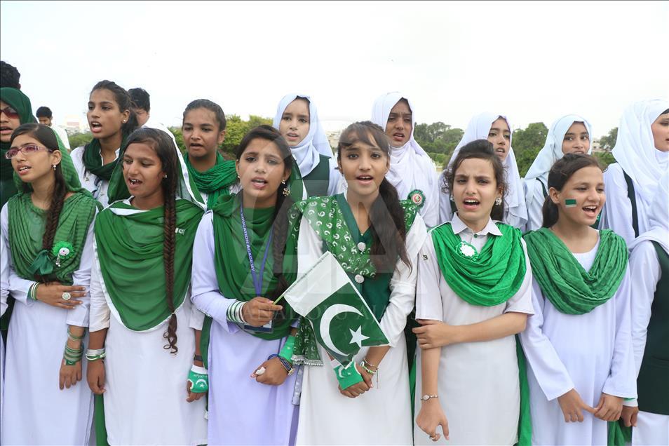 KARACHI, PAKISTAN - AUGUST 14: Pakistani girls sing national songs during a ceremony marking Pakistan's 70th Independence Day at the founder of Pakistan Muhammad Ali Jinnah's mausoleum in Karachi, Pakistan on August 14, 2017. Sabir Mazhar