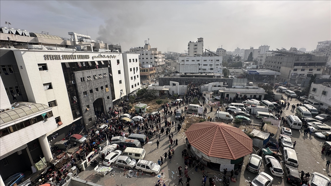 An aerial view of Al-Shifa Hospital, where Palestinians are sheltering and trying to survive under difficult conditions due to the ongoing Israeli attacks in Gaza City