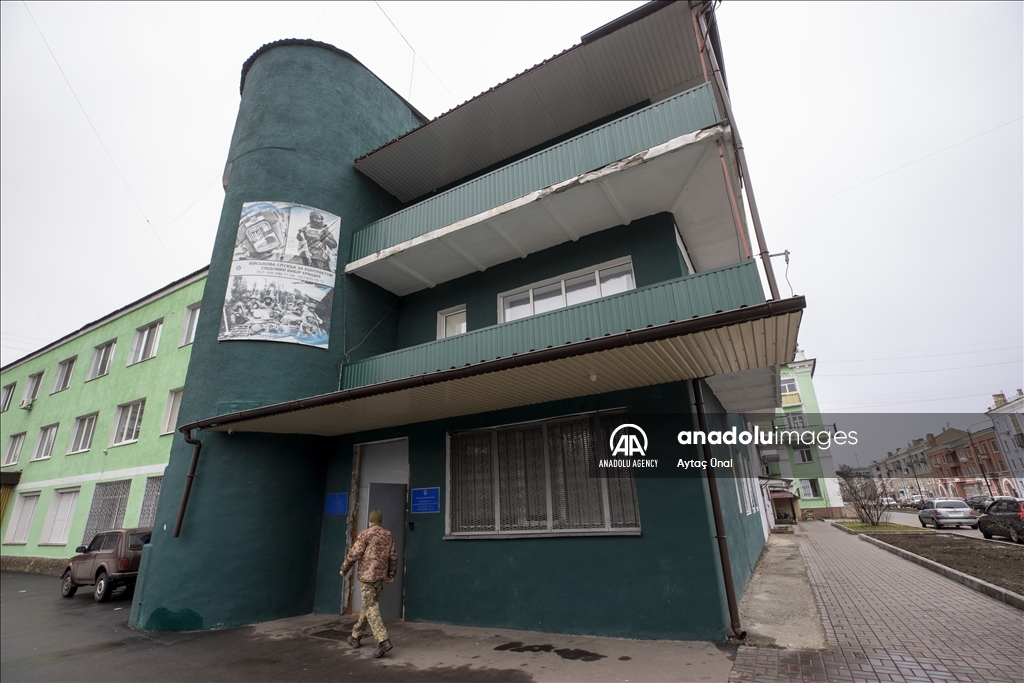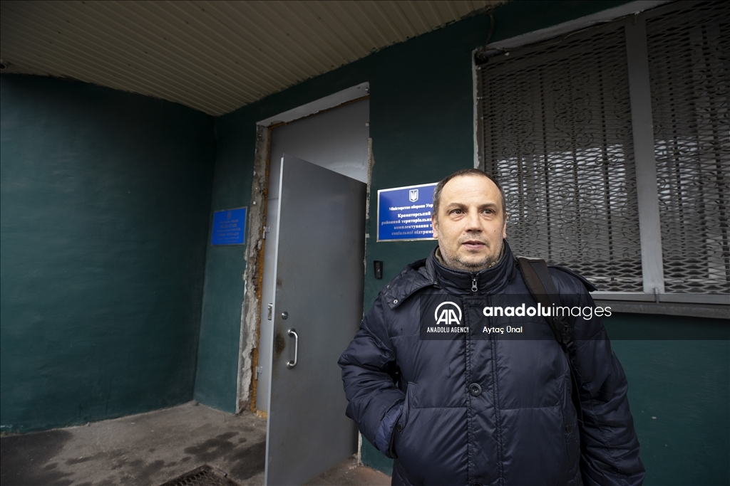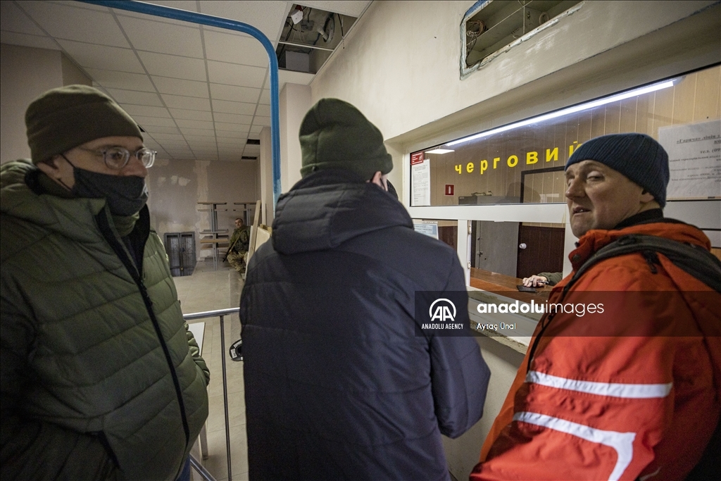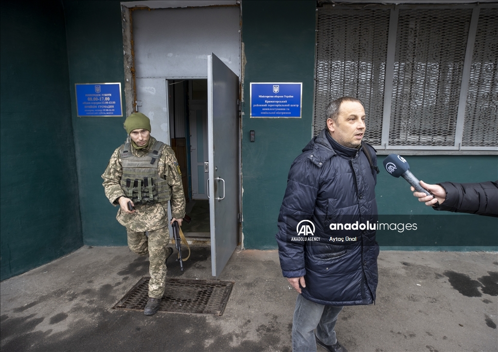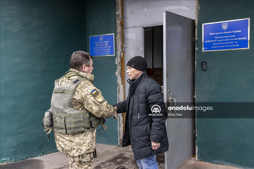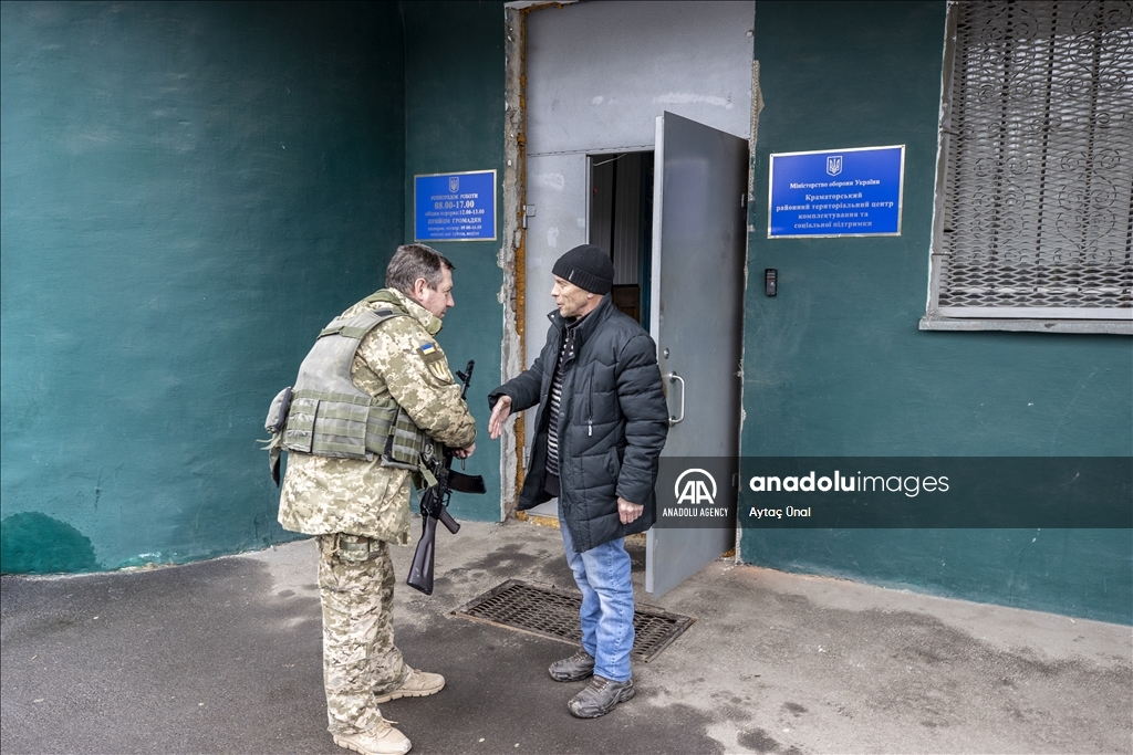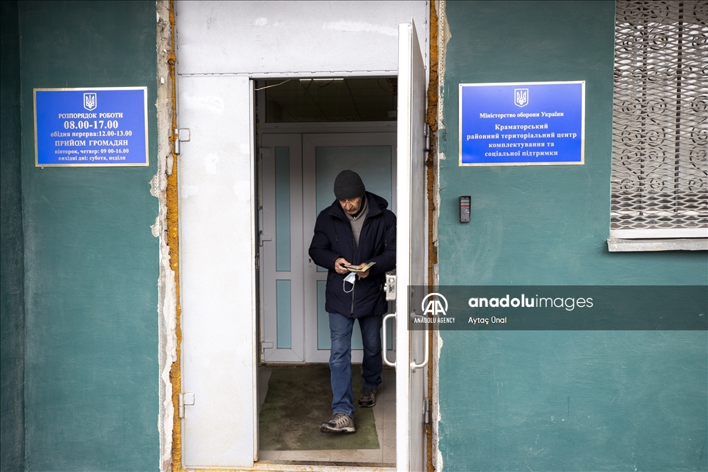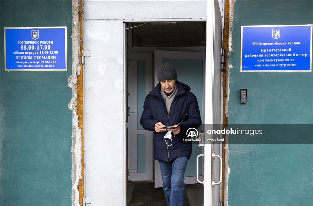 People in city of Kramatorsk in restive Donbas region line up at military registration office to voluntarily join Territorial Defense Forces