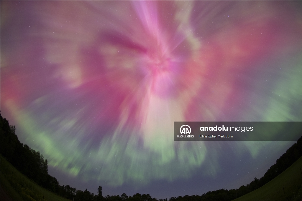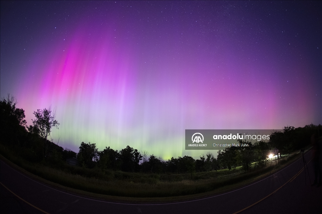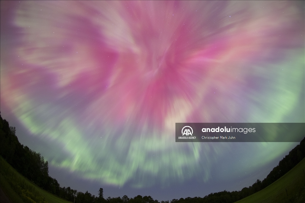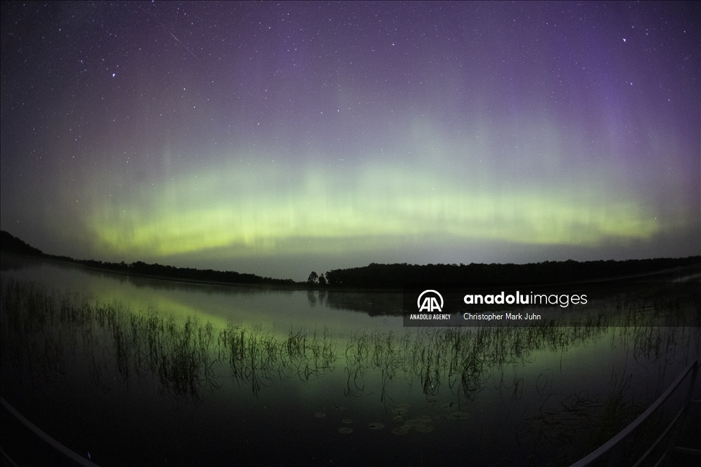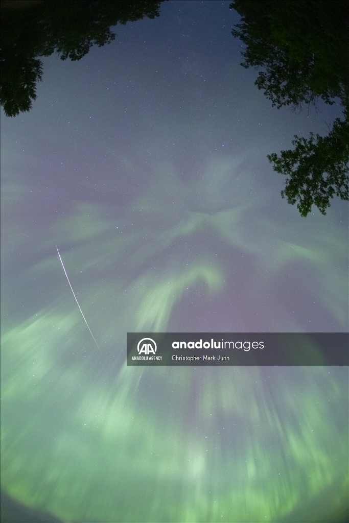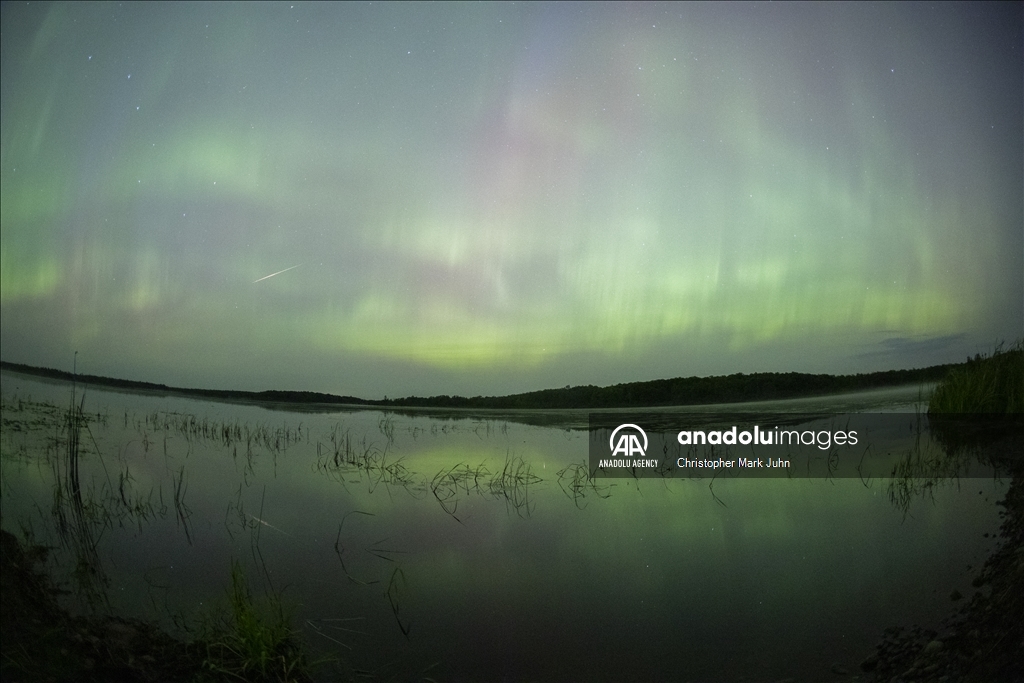 A meteor streaks across the sky during Perseid meteor shower as the northern lights (Aurora Borealis) illuminating the sky with a geomagnetic storm is bringing vibrant green and pink colors in, Minnesota, United States