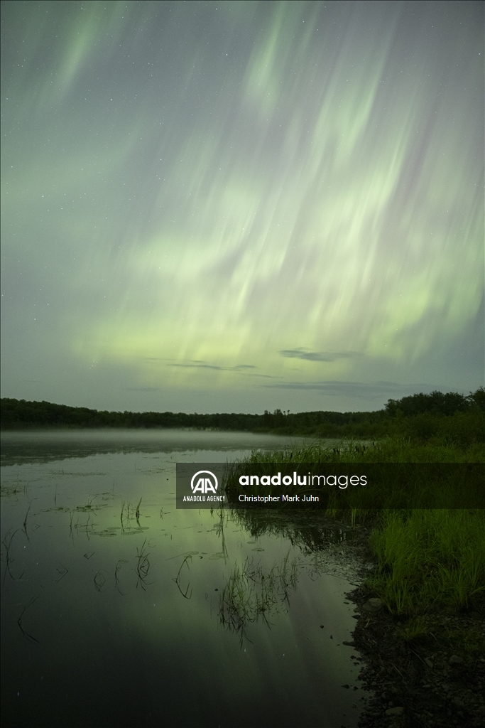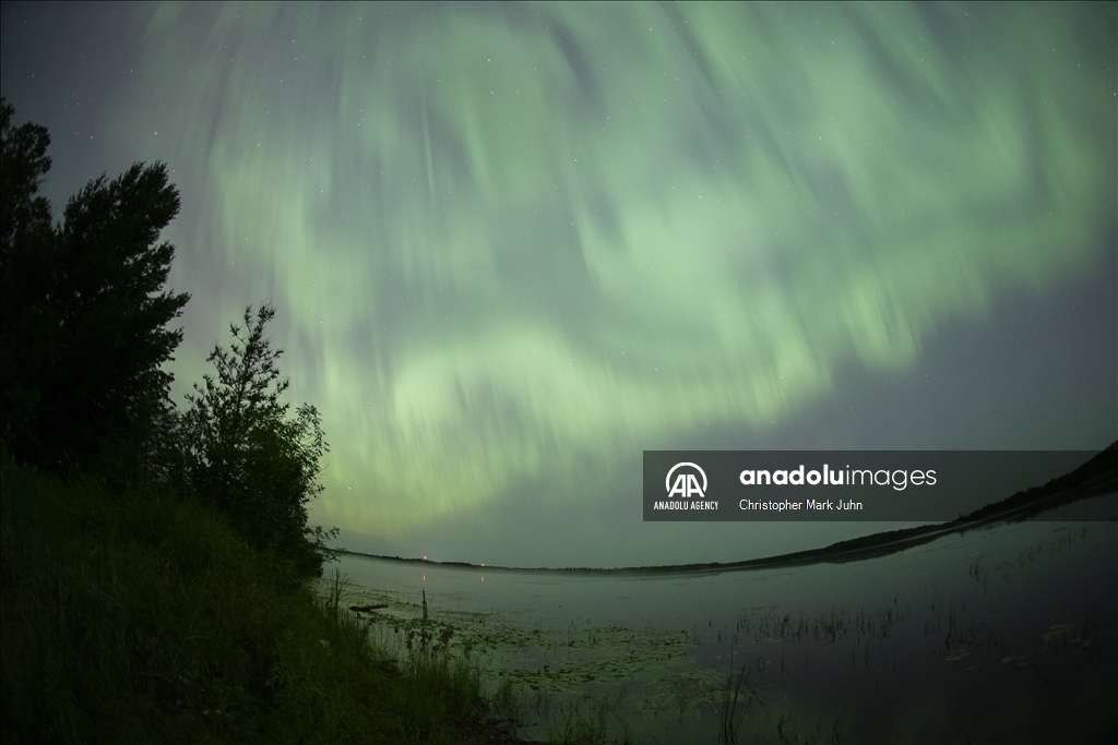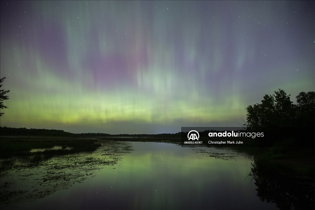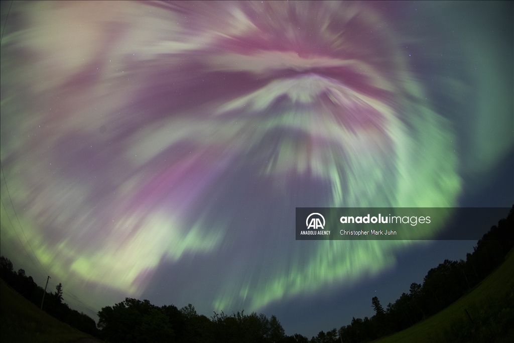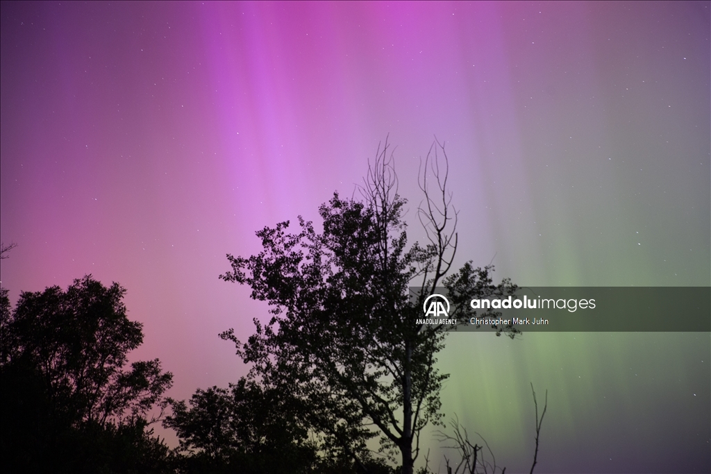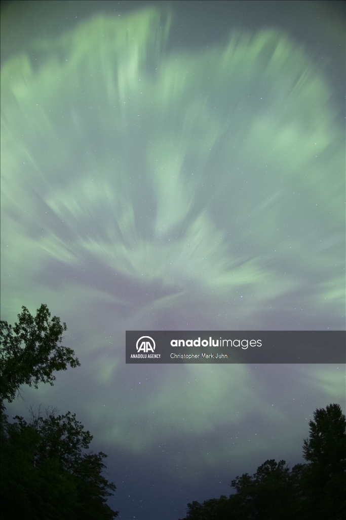 A meteor streaks across the sky during Perseid meteor shower as the northern lights (Aurora Borealis) illuminating the sky with a geomagnetic storm is bringing vibrant green and pink colors in, Minnesota, United States