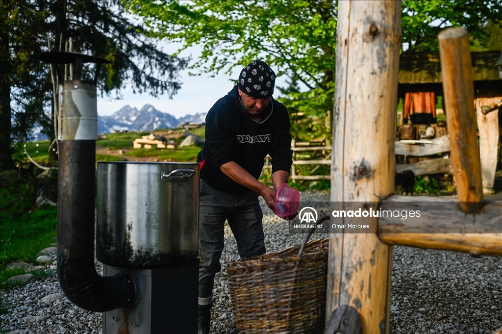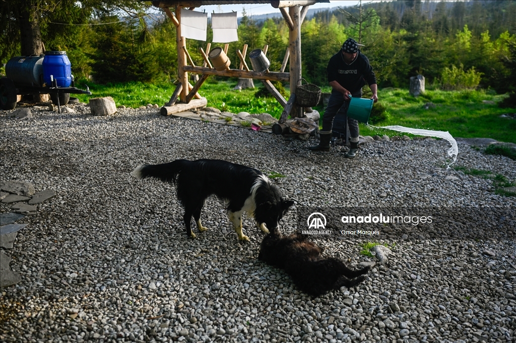 BUKOWINA TATRZANSKA, POLAND - MAY 21: A Polish shepherd washes food plates by the entrance of the shelter at the Tatra Mountains National Park in Bukowina Tatrzanska, Poland on May 21, 2024. Cultural grazing is a pastoral economy carried out in national parks, permitted under numerous restrictions. It is also a form of protection of the mountain landscape and a unique way of transmitting and perpetuating pastoral traditions. The most famous is cultural grazing carried out in 30 clearings in the Tatra National Park. Shepherding has been added to the UNESCO's Intangible Cultural Heritage list meaning that the native tradition of shepherding and sheep grazing will be cultivated, maintained and, above all, protected. ( Omar Marques - Anadolu Agency )Omar Marques