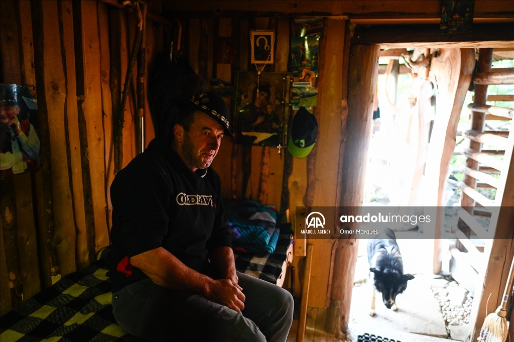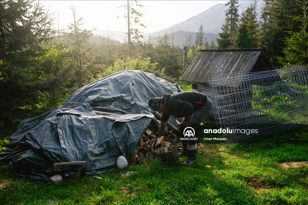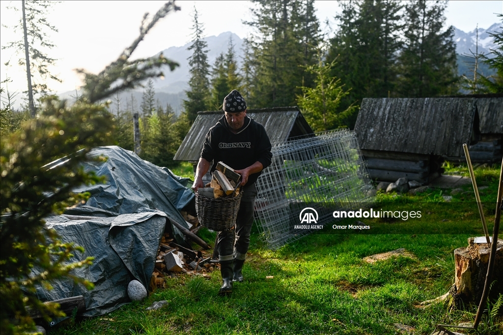 BUKOWINA TATRZANSKA, POLAND - MAY 21: A Polish shepherd picks wood for the oven at the Tatra Mountains National Park in Bukowina Tatrzanska, Poland on May 21, 2024. Cultural grazing is a pastoral economy carried out in national parks, permitted under numerous restrictions. It is also a form of protection of the mountain landscape and a unique way of transmitting and perpetuating pastoral traditions. The most famous is cultural grazing carried out in 30 clearings in the Tatra National Park. Shepherding has been added to the UNESCO's Intangible Cultural Heritage list meaning that the native tradition of shepherding and sheep grazing will be cultivated, maintained and, above all, protected. ( Omar Marques - Anadolu Agency )Omar Marques