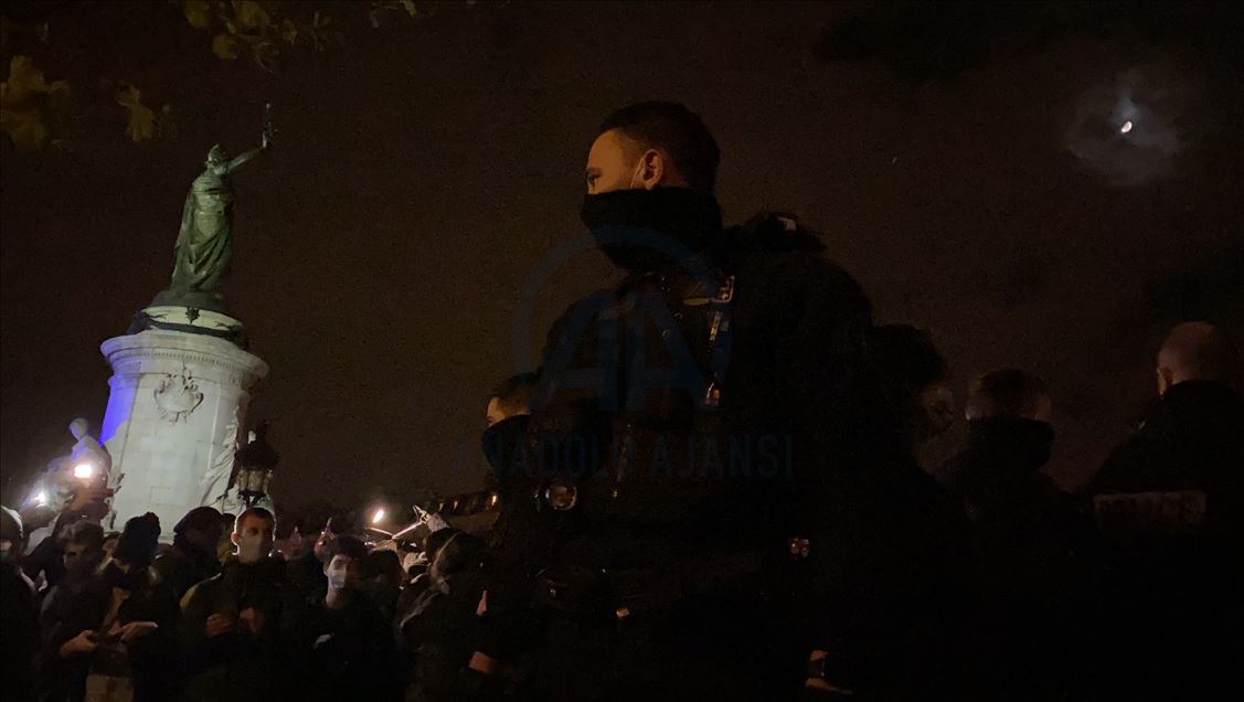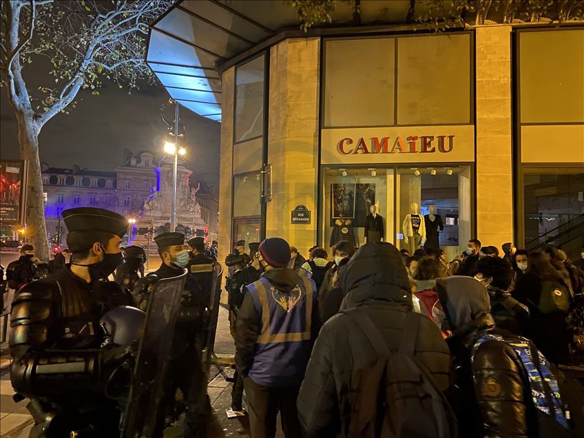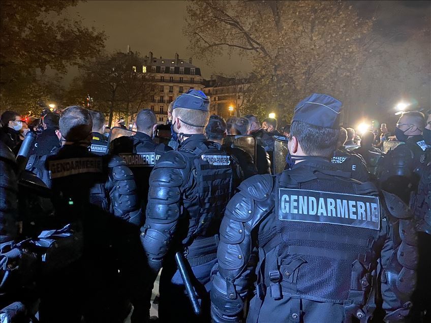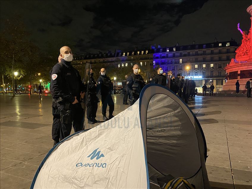 Police and gendarmerie officers intervene in refugees who came to Republique Square in the evening hours and set up camp, on November 23, 2020 in Paris, France.