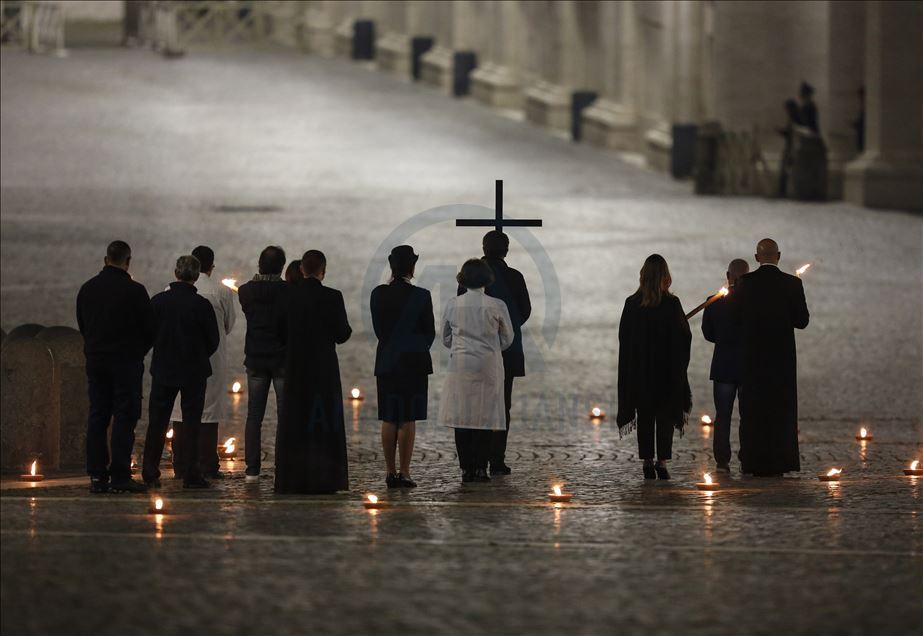 VATICAN CIY, VATICAN - APRIL 10: Pope Francis presides the Via Crucis (Way of the Cross) torchlight procession to commemorate the crucifixion of Jesus Christ, in St. Peter's Square at the Vatican on Good Friday April 10, 2020. The lockdown aimed to contrast the coronavirus (Covid-19) outbreak forced the Vatican to reorganize the celebrations marking the Holy Week preceding Easter. The Way of the Cross torchlight procession, usually celebrated at Rome's Colosseum with a great participation of faithful, has been moved to an empty St. Peter's Square. ( Riccardo De Luca - Anadolu Agency )Riccardo De Luca
