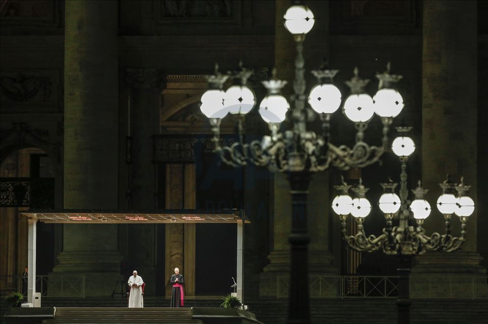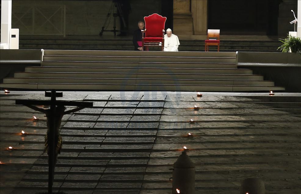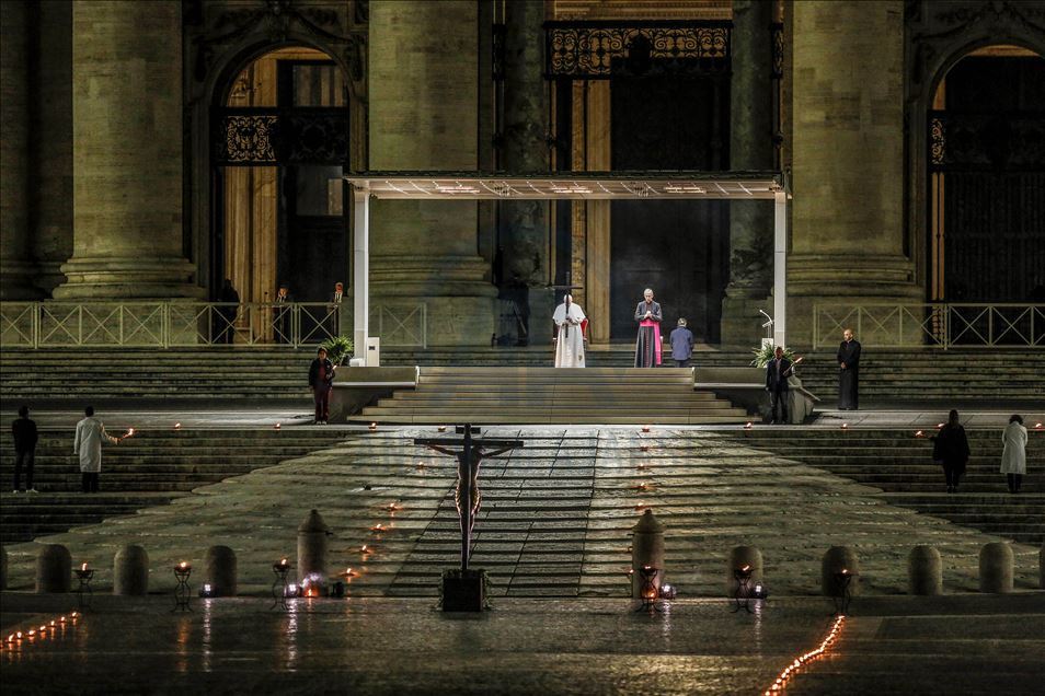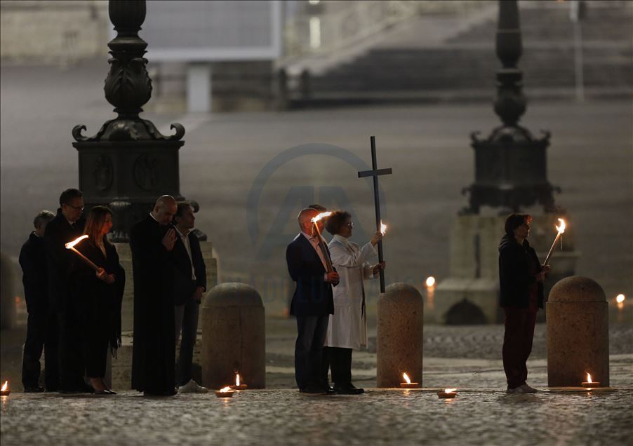 VATICAN CITY, VATICAN, APRIL 10: Pope Francis presides the Via Crucis (Way of the Cross) torchlight procession to commemorate the crucifixion of Jesus Christ, in St. Peter's Square at the Vatican on Good Friday April 10, 2020. The lockdown aimed to contrast the covid-19 outbreak forced the Vatican to reorganize the celebrations marking the Holy Week preceding Easter. The Way of the Cross torchlight procession, usually celebrated at Rome's Colosseum with a great participation of faithful, has been moved to an empty St. Peter's Square. ( Riccardo De Luca - Anadolu Agency )Riccardo De Luca