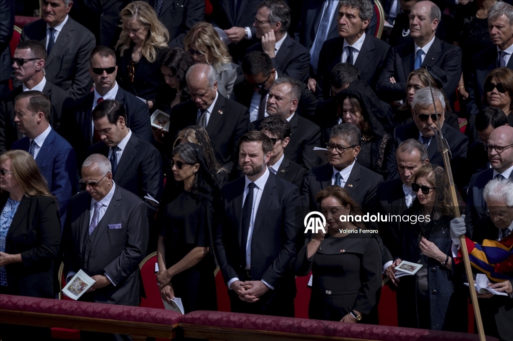 VATICAN CITY - MAY 18: U.S. Vice President JD Vance (C, bottom line), his wife Usha Vance (L, bottom), Peruvian President Dina Boluarte (C), Italian President Sergio Mattarella (R), and his daughter Laura Mattarella (C-R) are seen kneeling during the ceremony as newly elected Pope Leo XIV celebrates the Inauguration Mass marking the beginning of his pontificate, attended by 200 delegations including heads of state, ministers, and religious representatives, in Vatican City, on May 18, 2025. ( Valeria Ferraro - Anadolu Agency )Valeria Ferraro