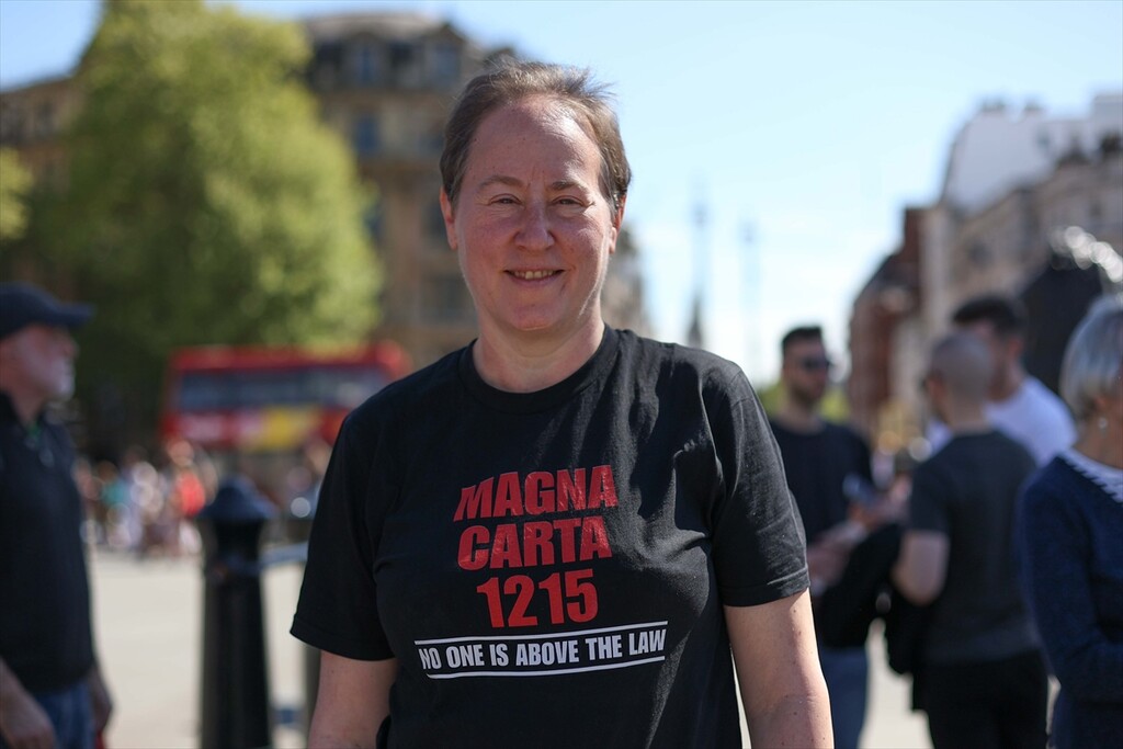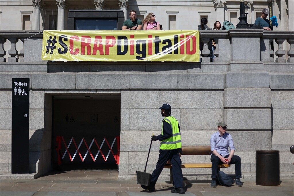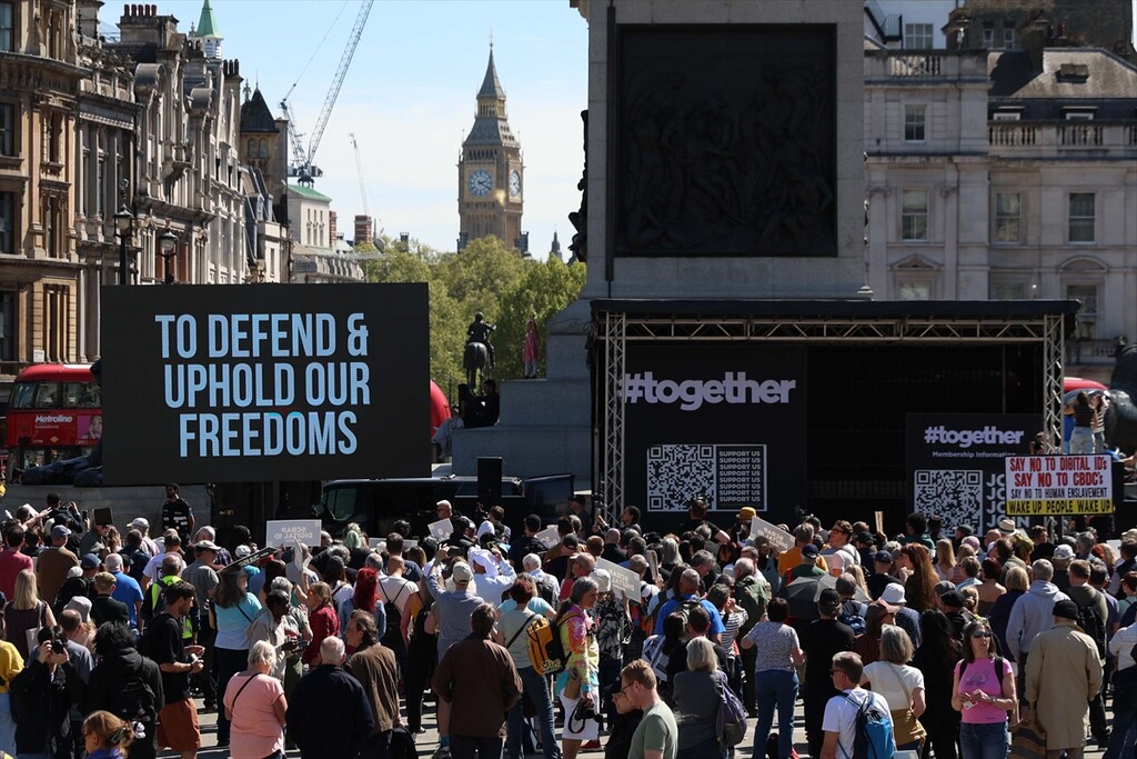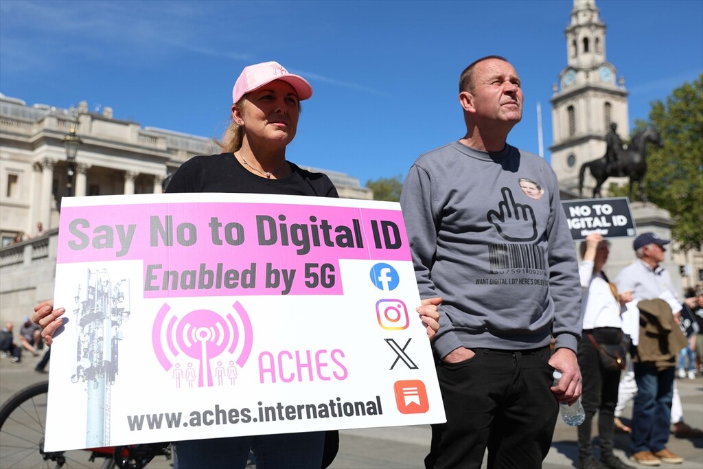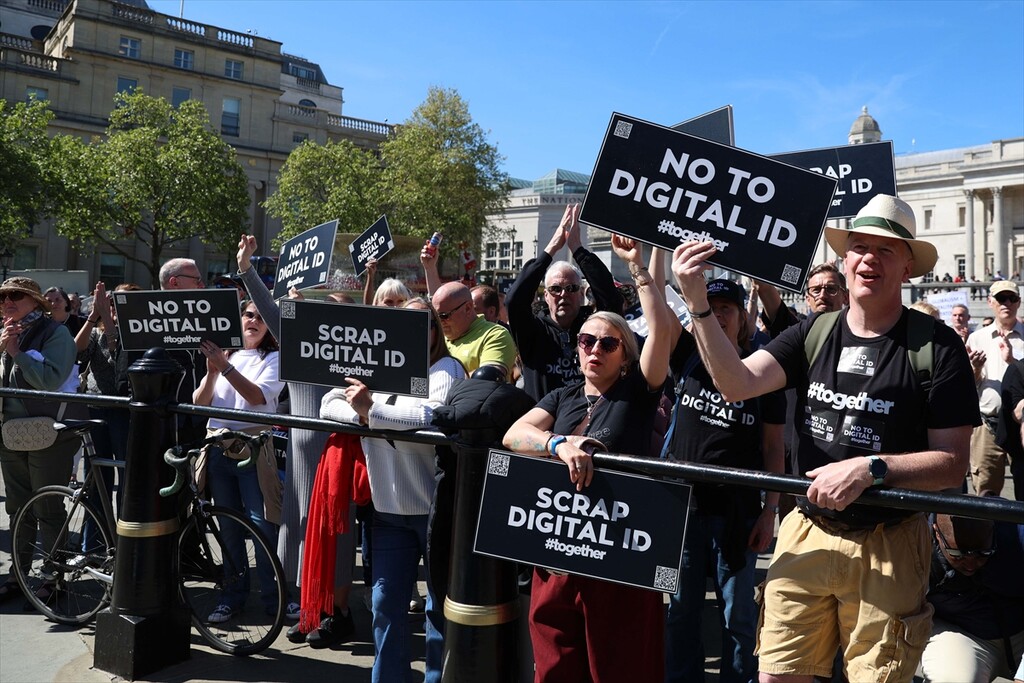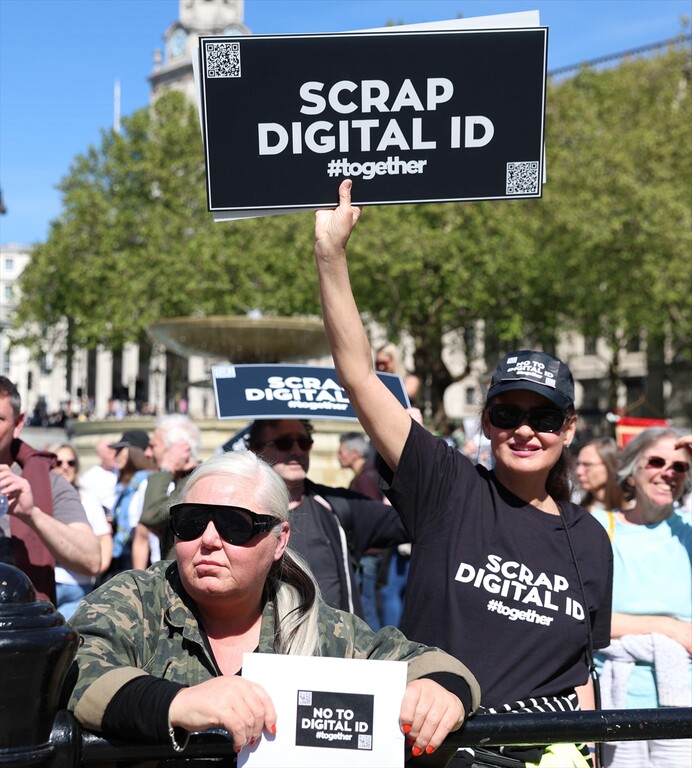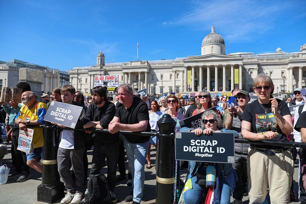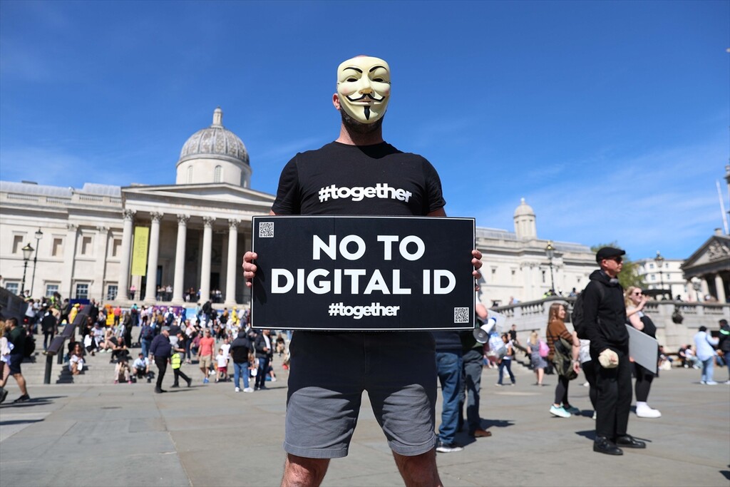 Demonstrators gather at Trafalgar Square to protest against digital identity systems in London, United Kingdom on April 24, 2026.