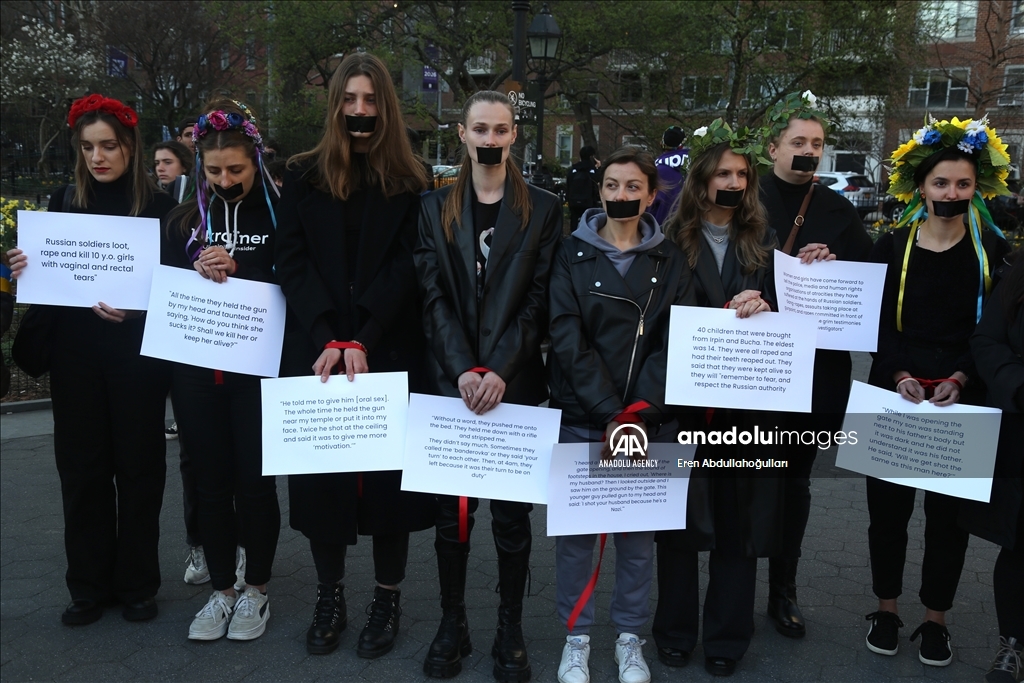 People participate in a flash mob protest against the Russian attacks on Ukraine, in Manhattan at Washington Square Park in New York City on April 8, 2022