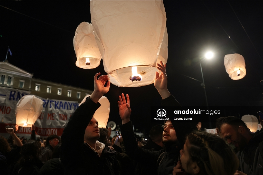ATHENS, GREECE - MARCH 05: People take part in a protest, as parliament debates a censure motion against the government over its handling of the Tempe railway disaster, in Athens on March 5, 2025. ( Costas Baltas - Anadolu Agency )Costas Baltas
