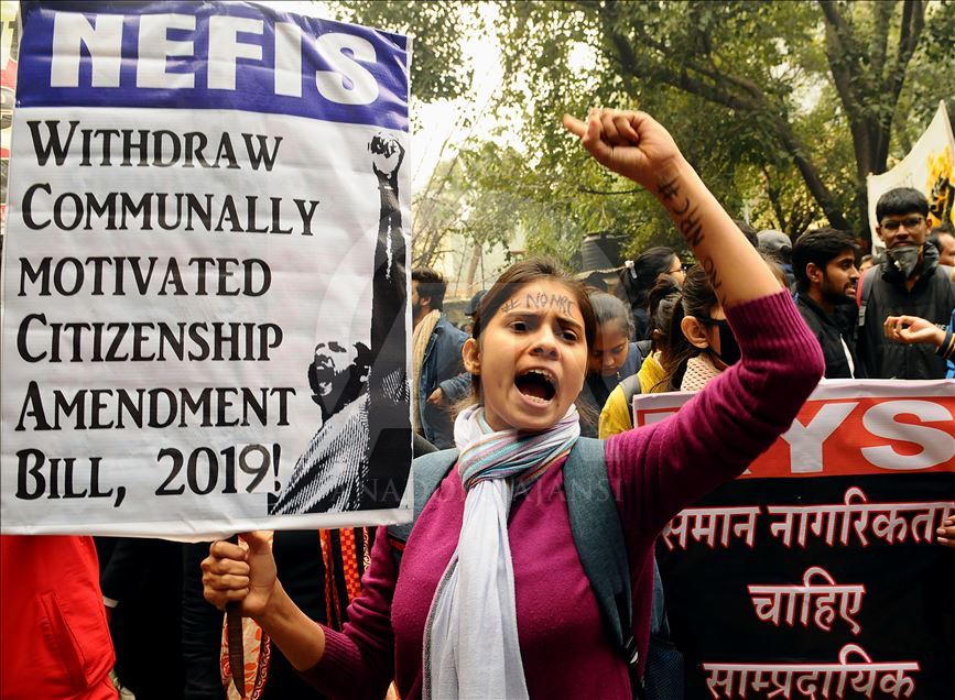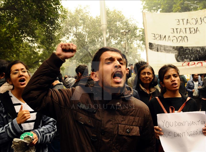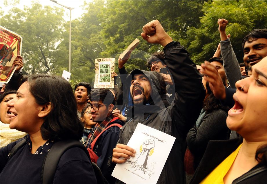 NEW DELHI, INDIA - DECEMBER 19: People shout slogans during a demonstration against India’s new citizenship law in New Delhi, India on December 19, 2019. Indians defied bans on assembly on December 19 in cities nationwide as anger swells against a citizenship law seen as discriminatory against Muslims, following days of protests, clashes and riots that have left six dead. ( İmtiyaz Khan - Anadolu Agency )İmtiyaz Khan