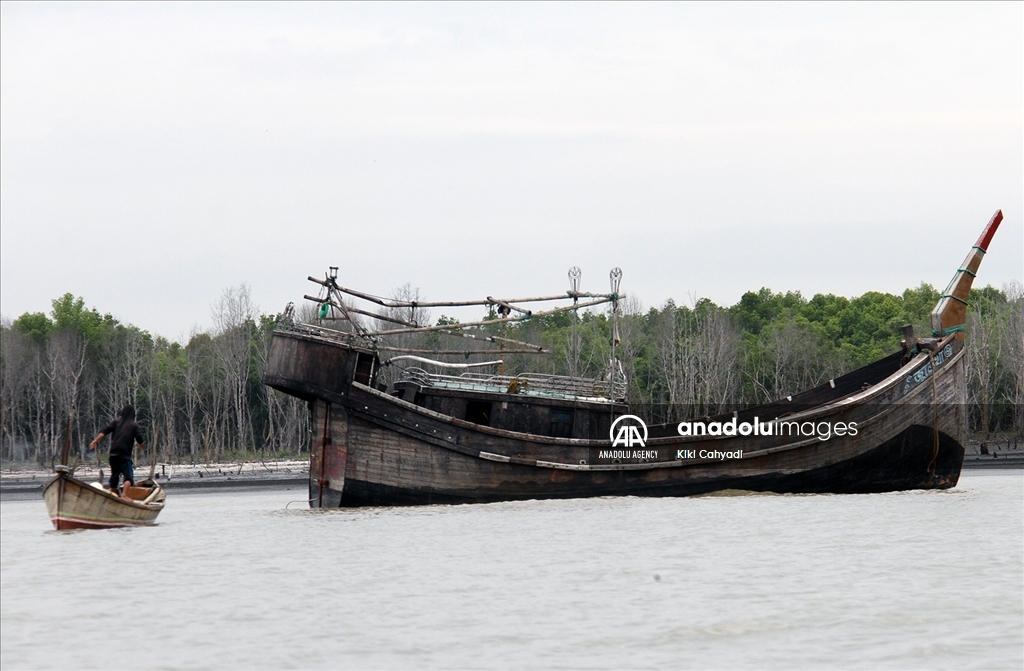 NORTH SUMATRA, INDONESIA - JANUARY 01: A view of the boat Rohingya immigrants stranded on as they gather in tents at Karang Gading Village in Labuhan Deli, Deli Serdang Regency, North Sumatra, Indonesia on January 1, 2024. A total of 147 Rohingya ethnic immigrants were stranded in the waters of Karang Gading Village on Saturday. ( Kiki Cahyadi - Anadolu Agency )Kiki Cahyadi