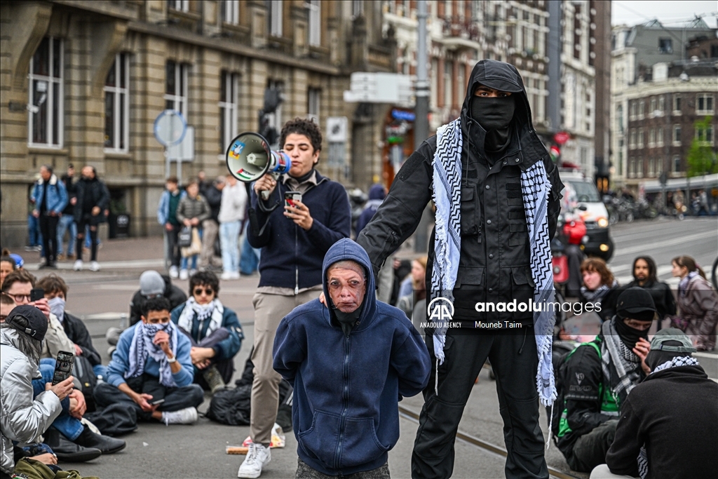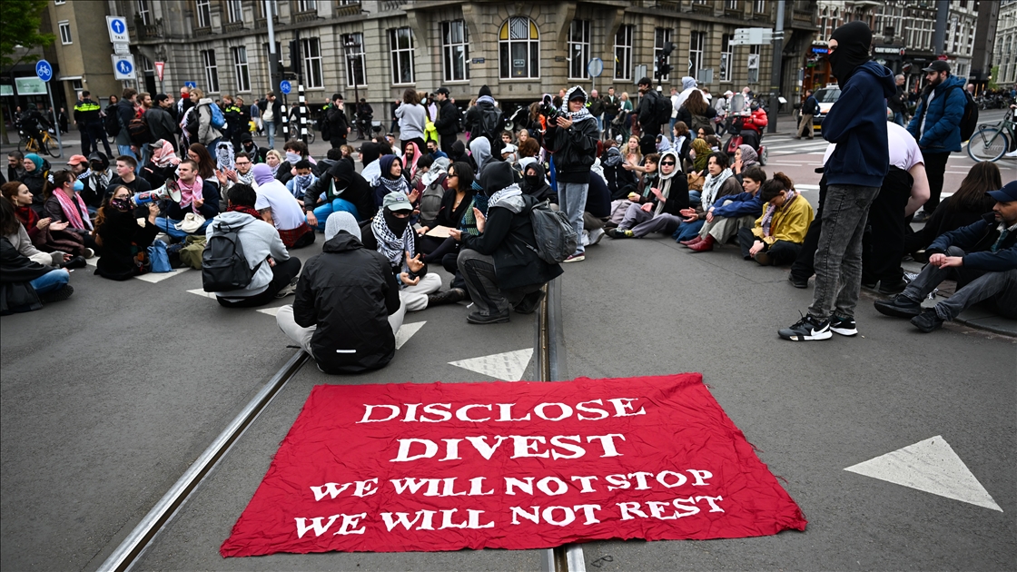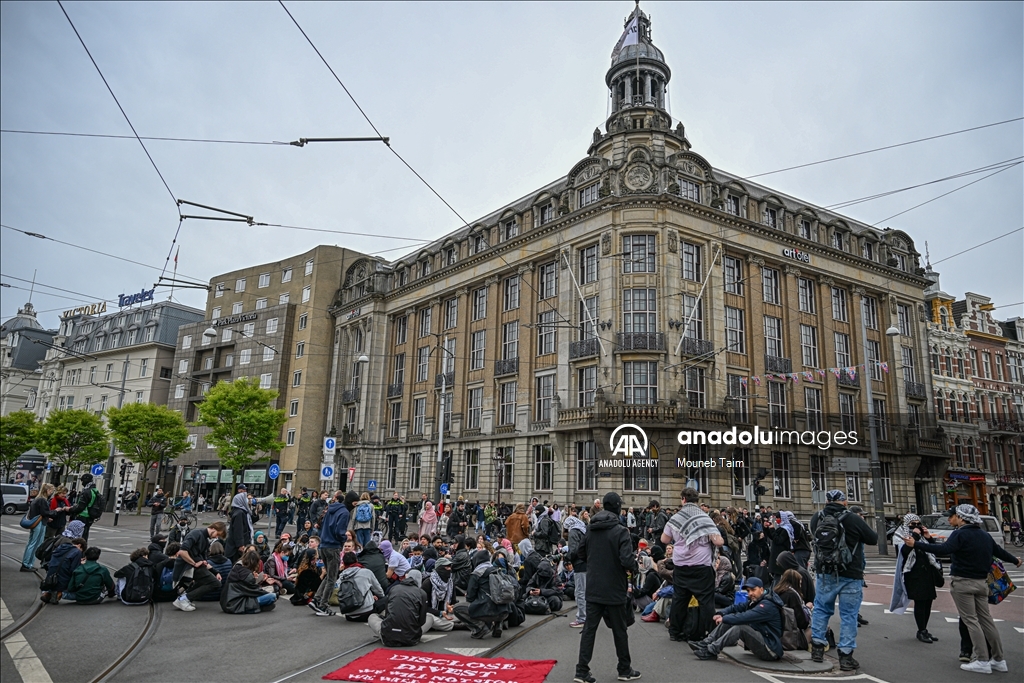 AMSTERDAM, NETHERLANDS - APRIL 17: Students stage a sit-in protest at Roeterseiland as part of the Amsterdam Student Encampment in Amsterdam, Netherlands on April 17, 2025. The demonstration voiced support for Palestinians and demanded an end to institutional ties with pro-Israel organizations. ( Mouneb Taim - Anadolu Agency )Mouneb Taim