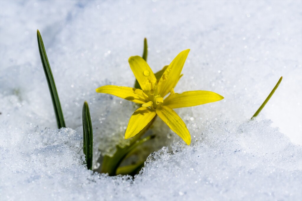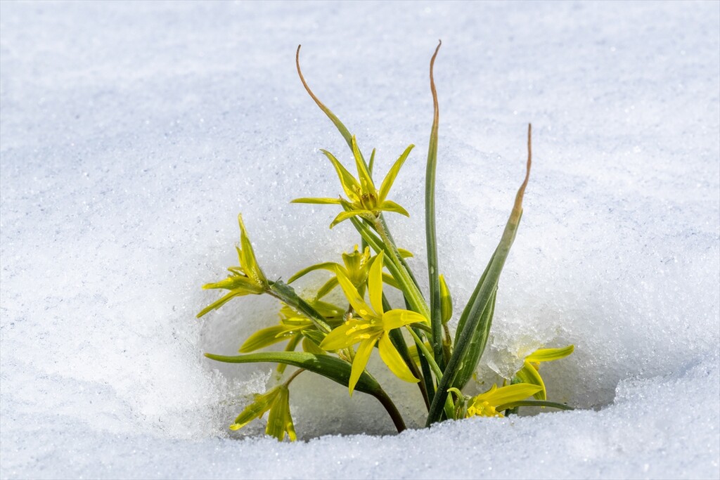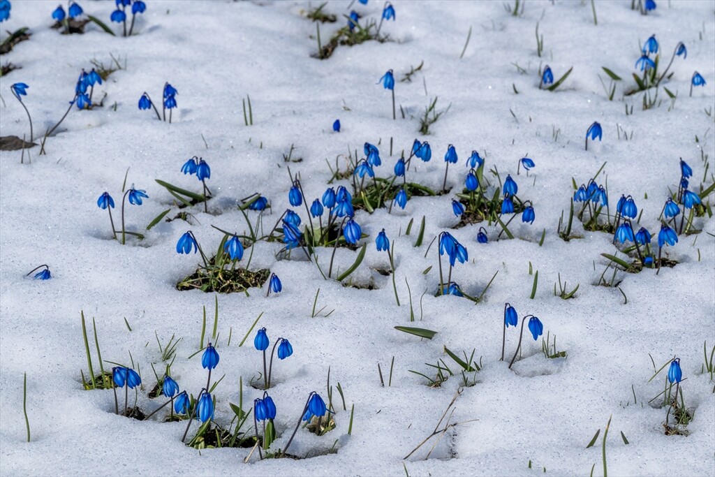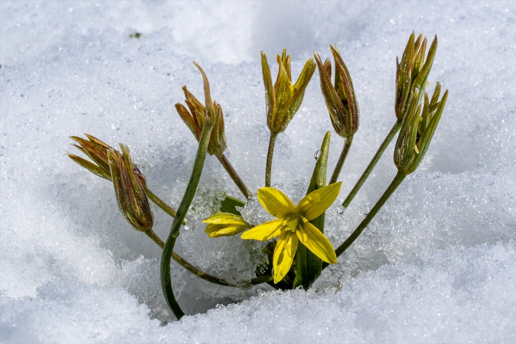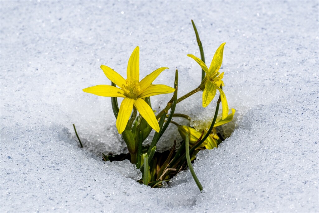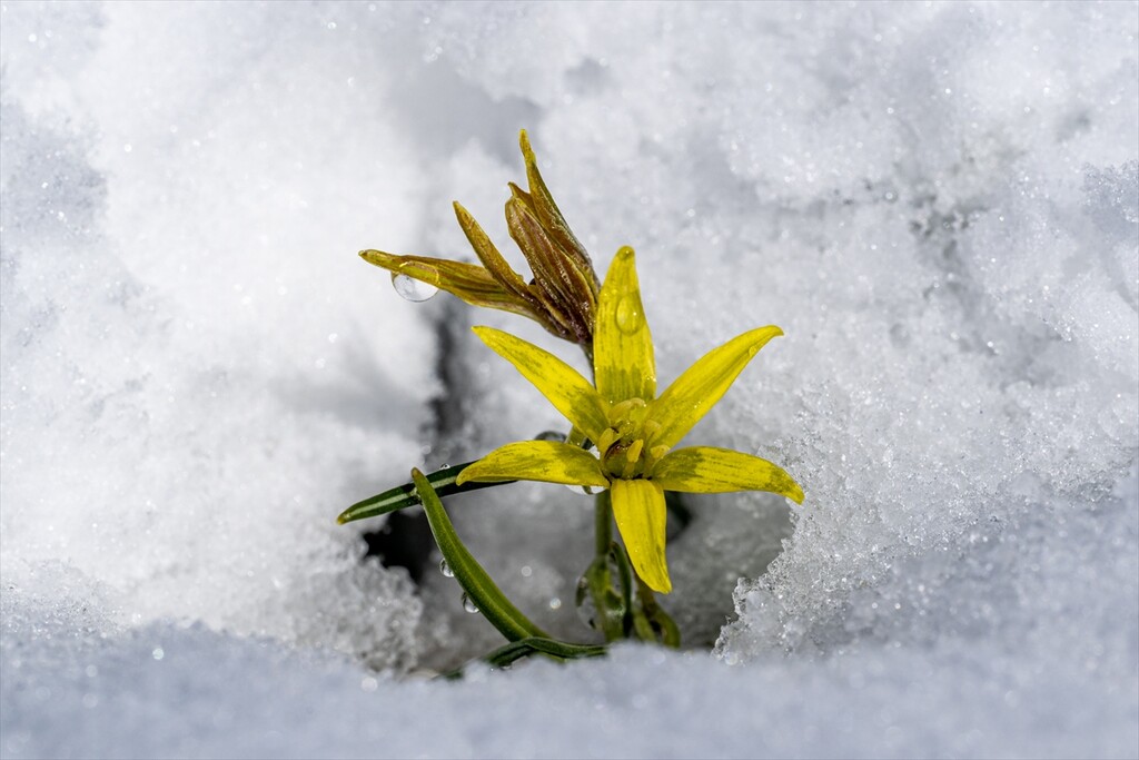 Flowers are seen amid snow as nature revives after a cold winter in Kars, Turkiye on April 25, 2026.