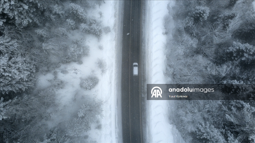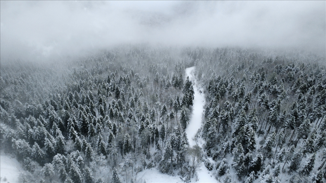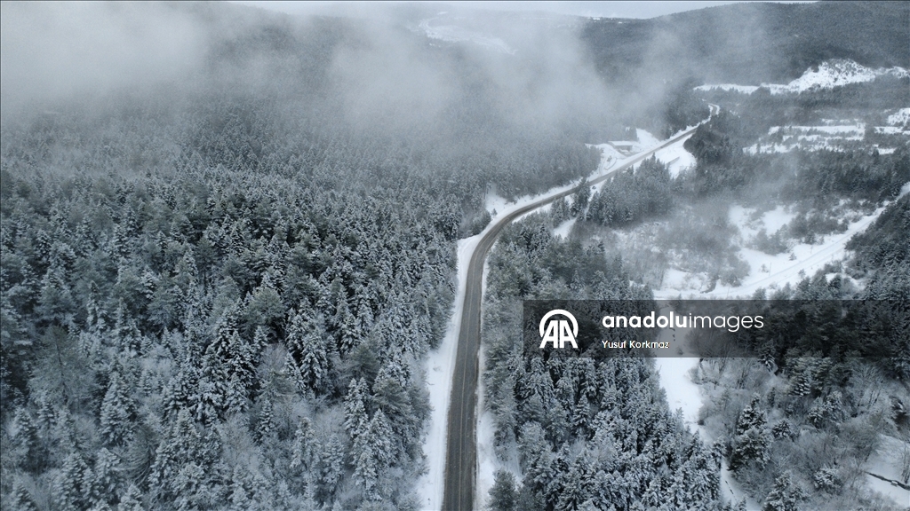 KARABUK, TURKIYE - JANUARY 12: An aerial view of snow-covered Ahmetusta Pass, located at an altitude of 1,030 meters on the Karabuk-Bartin highway as snowfall affecting the city center and districts of Karabuk, Turkiye on January 12, 2026. ( Yusuf Korkmaz - Anadolu Agency )Yusuf Korkmaz
