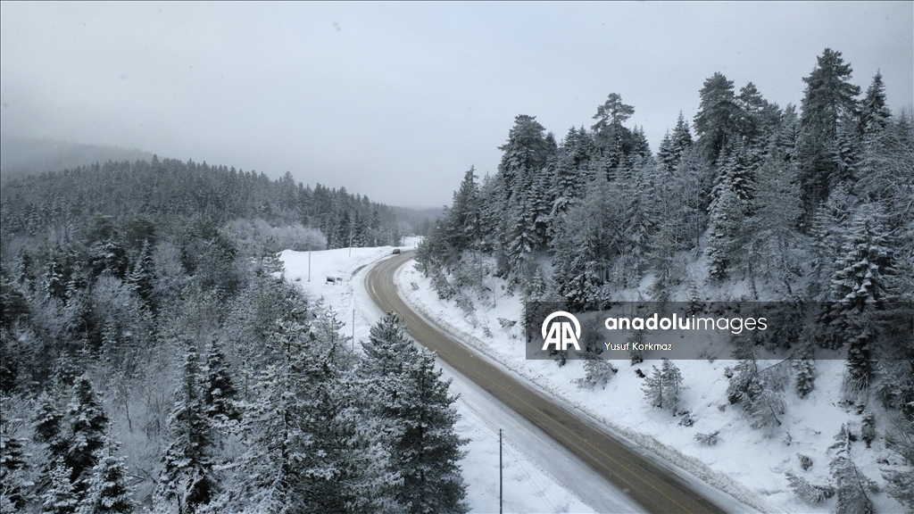 An aerial view of snow-covered Ahmetusta Pass, located at an altitude of 1,030 meters on the Karabuk-Bartin highway as snowfall affecting the city center and districts of Karabuk, Turkiye on January 12, 2026